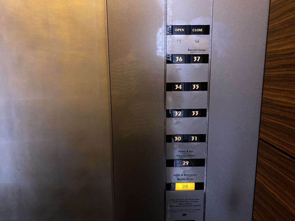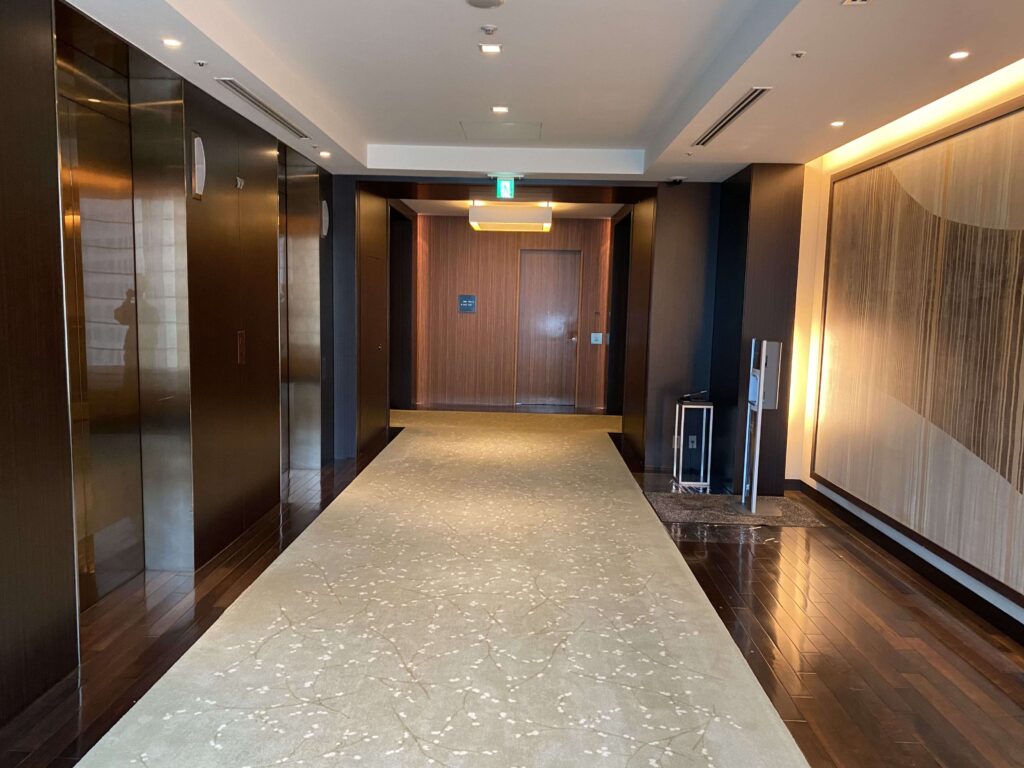 ▲35階のエレベーターホール。濃い茶色の感じが僕好み。じゅうだんも、和っぽくて、日本にいる実感が沸きますね。外国人の方にウケがよさそう。