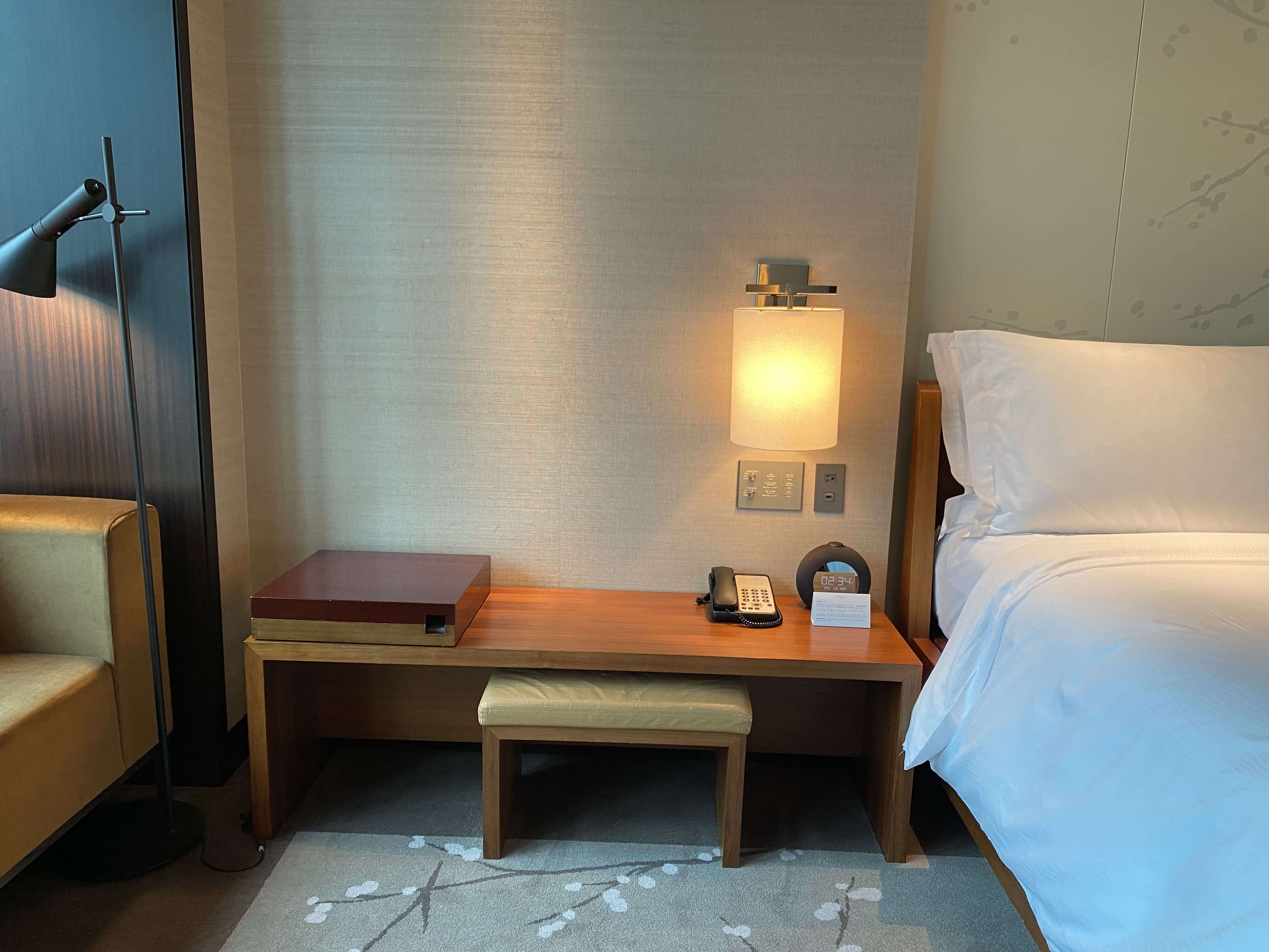 まずは、ベッドの枕元。ライティングが和洋折衷な感じで、とてもいい…。
