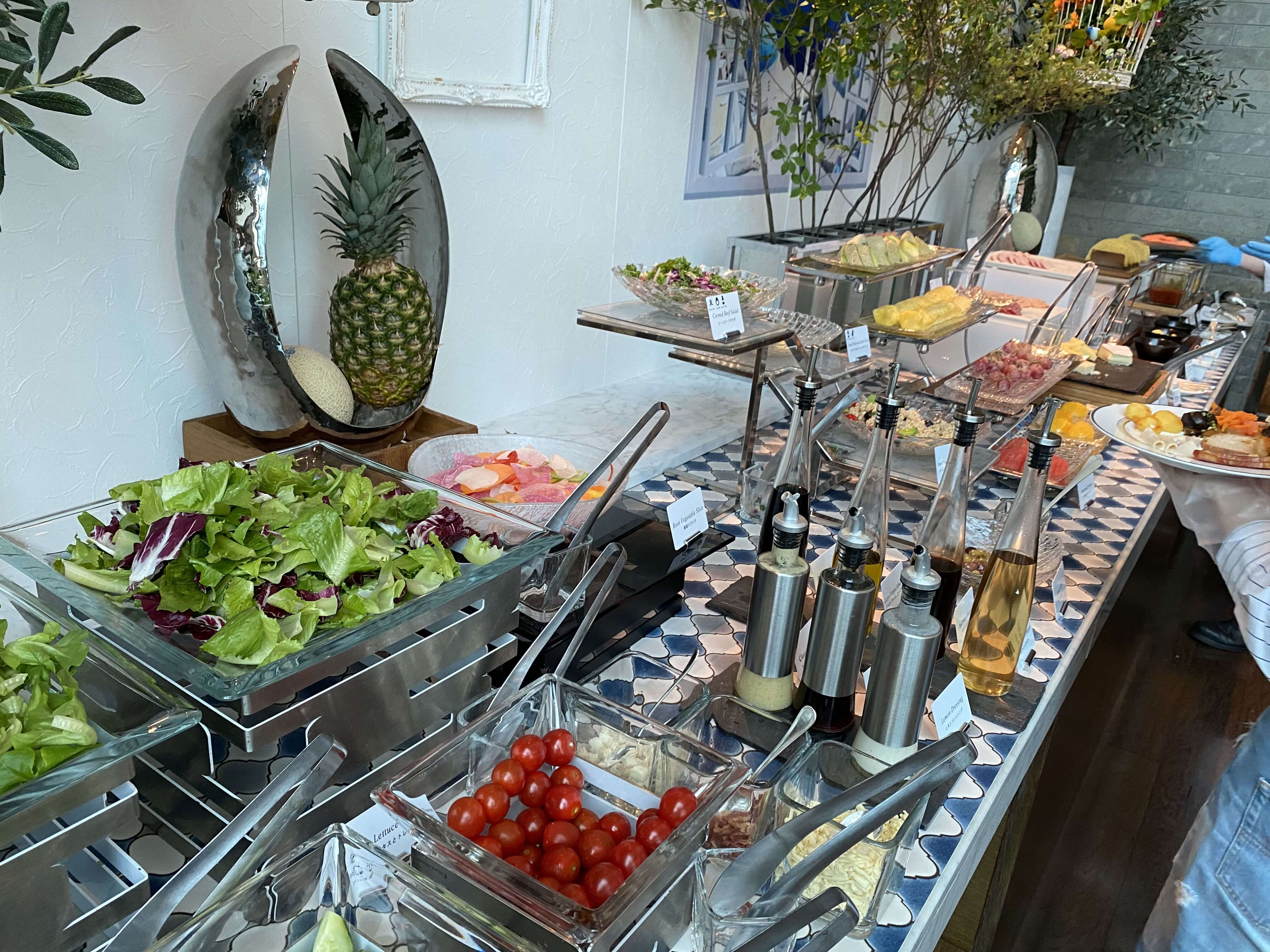 フルーツやサラダの種類も豊富!サラダは根菜ミックスがあったりするし、ドレッシングも豊富で大満足!フルーツも定番ものはしっかり揃っていて、こちらも最高でした!
