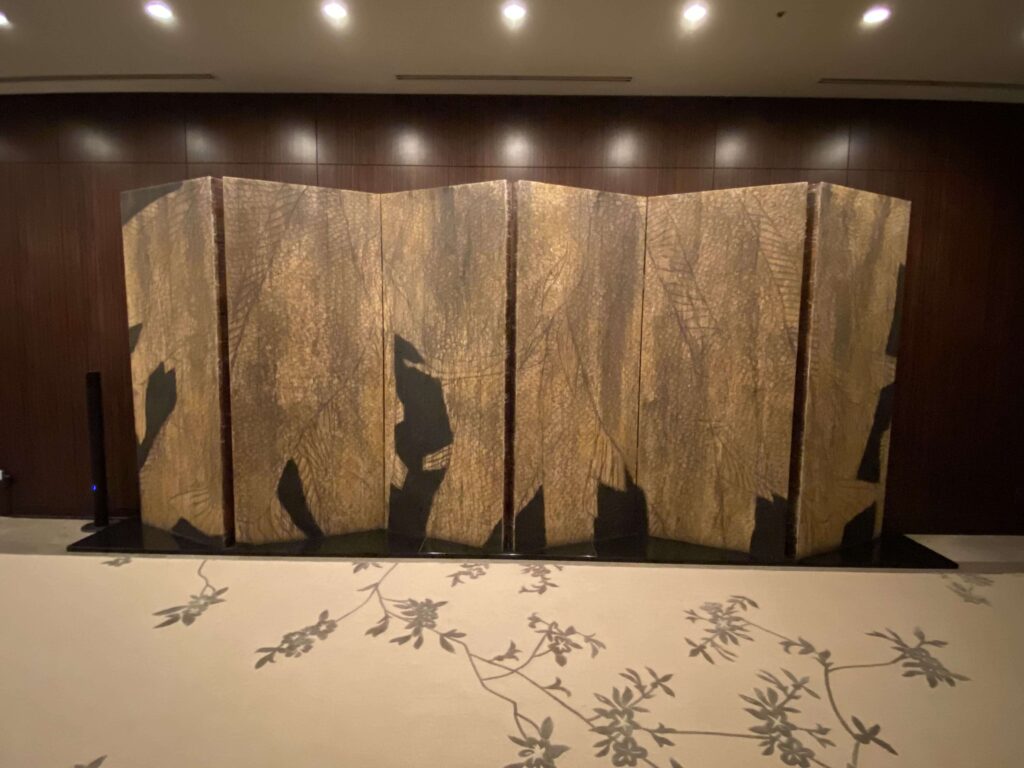 和な装飾。屏風のようなもの。1階のレセプションからこのエレベーターフロアまででも、コンラッド東京は、多数のアート作品を配置しており、美術館のようでした。
