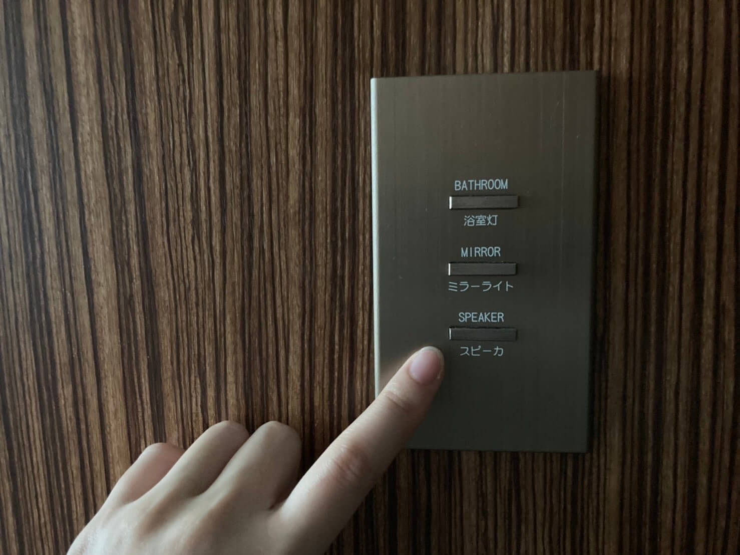 スピーカースイッチこのスピーカーを押すと、音楽がバスルームに!ヒーリングミュージックを聴きながら、バスタイムを楽しめるんですよね。