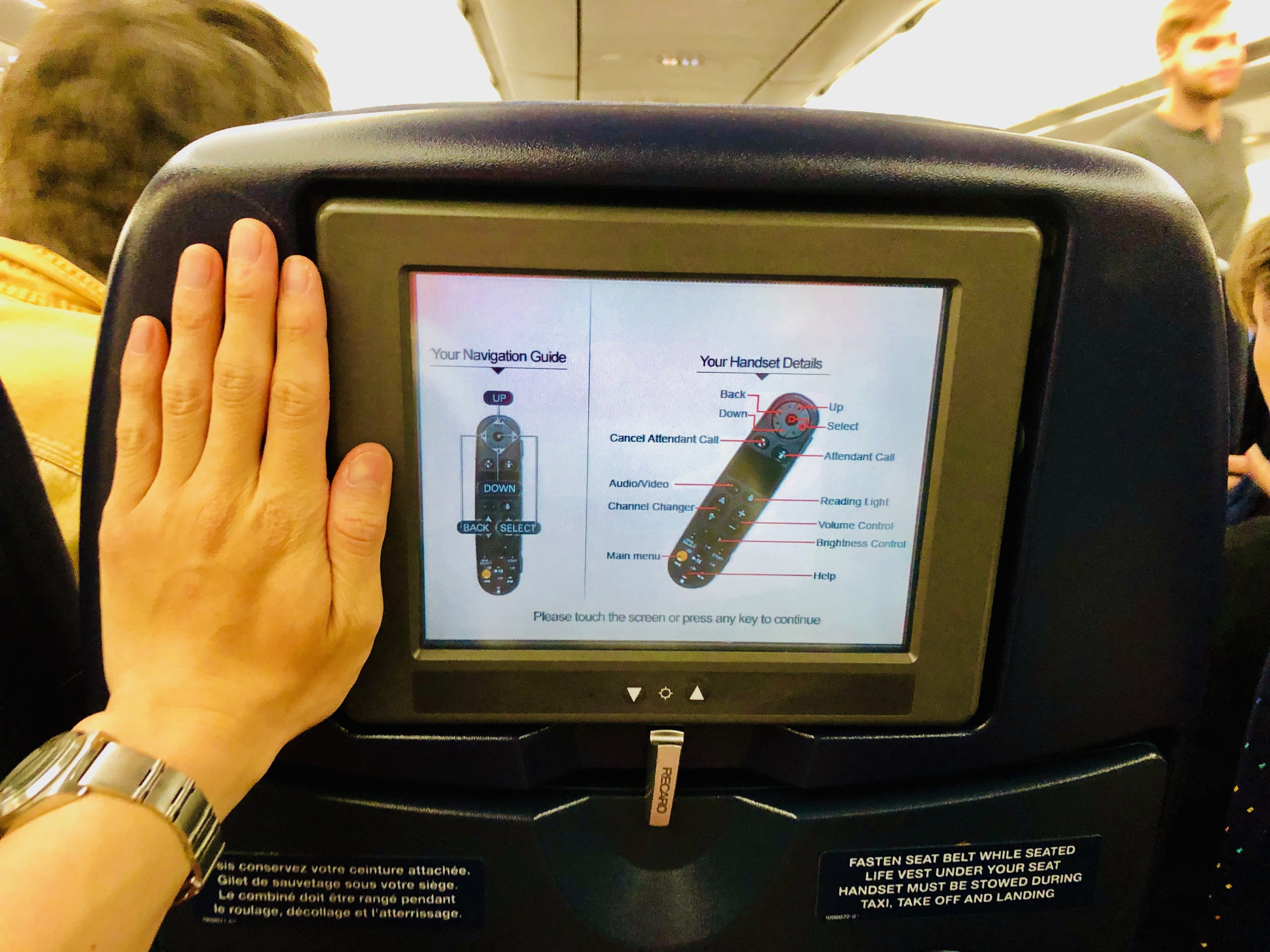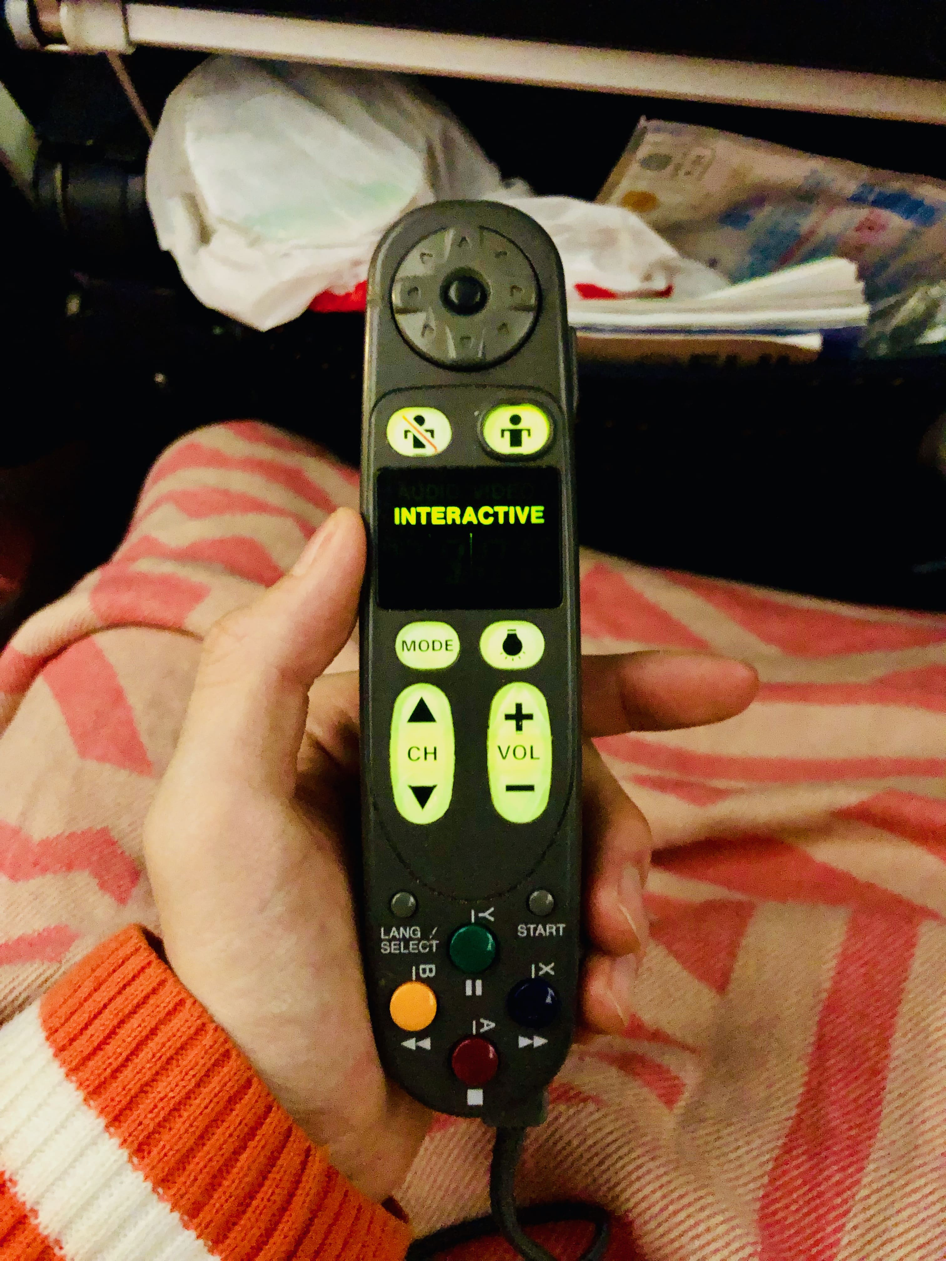 リモコンも同じく左の手かけ部分にあります。取り出してみるとこんな感じ。(今まで使ってきた航空会社の中で一番古いかも笑)