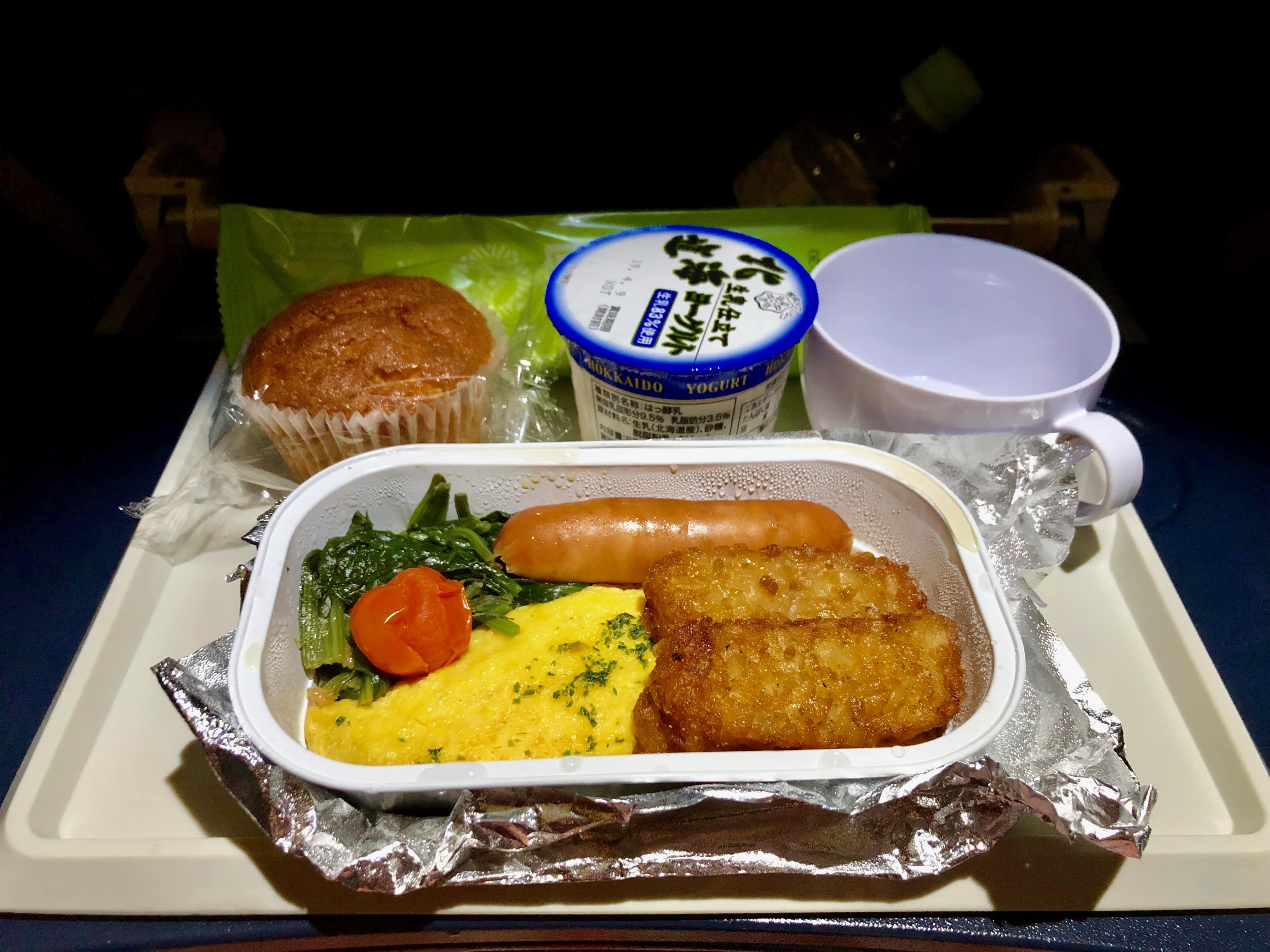 オムレツに、ソーセージ、ほうれん草(多分)、ポテト。ヨーグルト、マフィン。日本で作られたものなので、まずくはありません!(美味しいとは言わない)