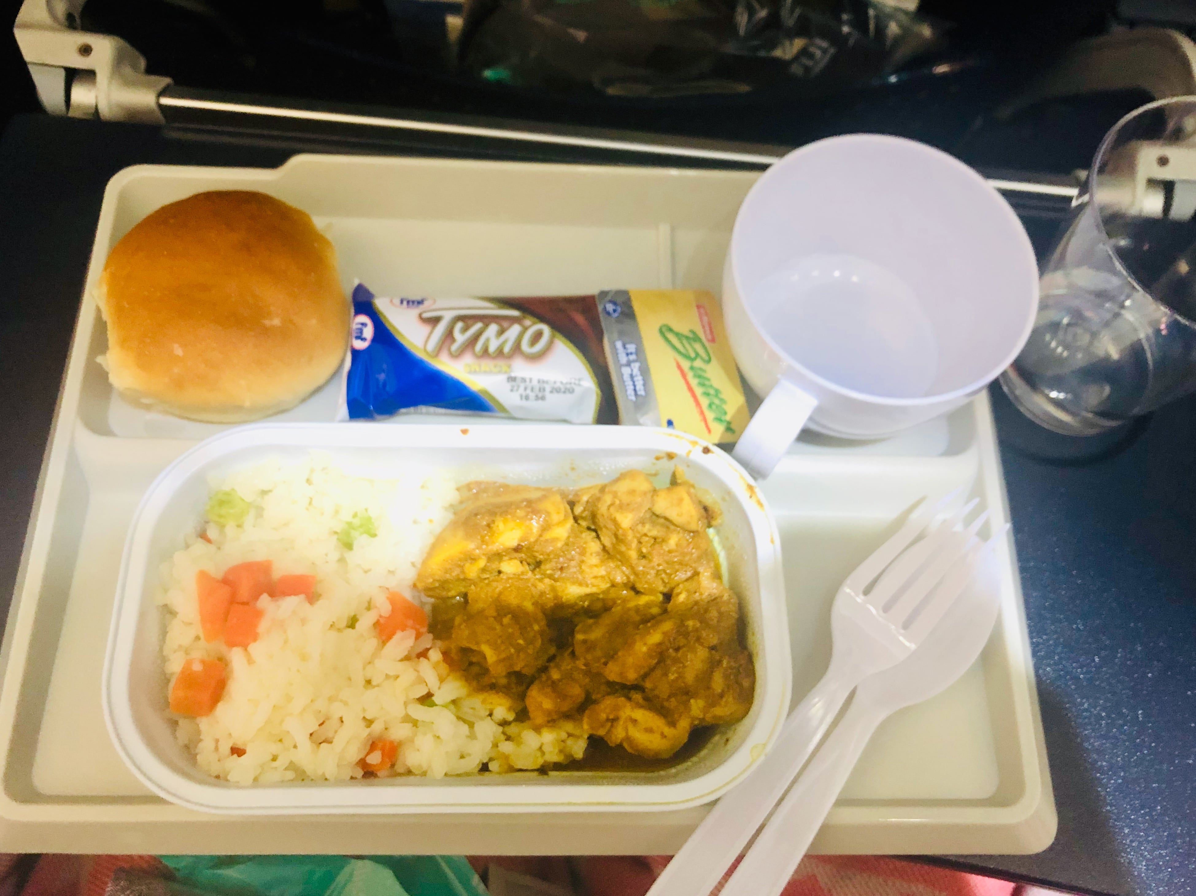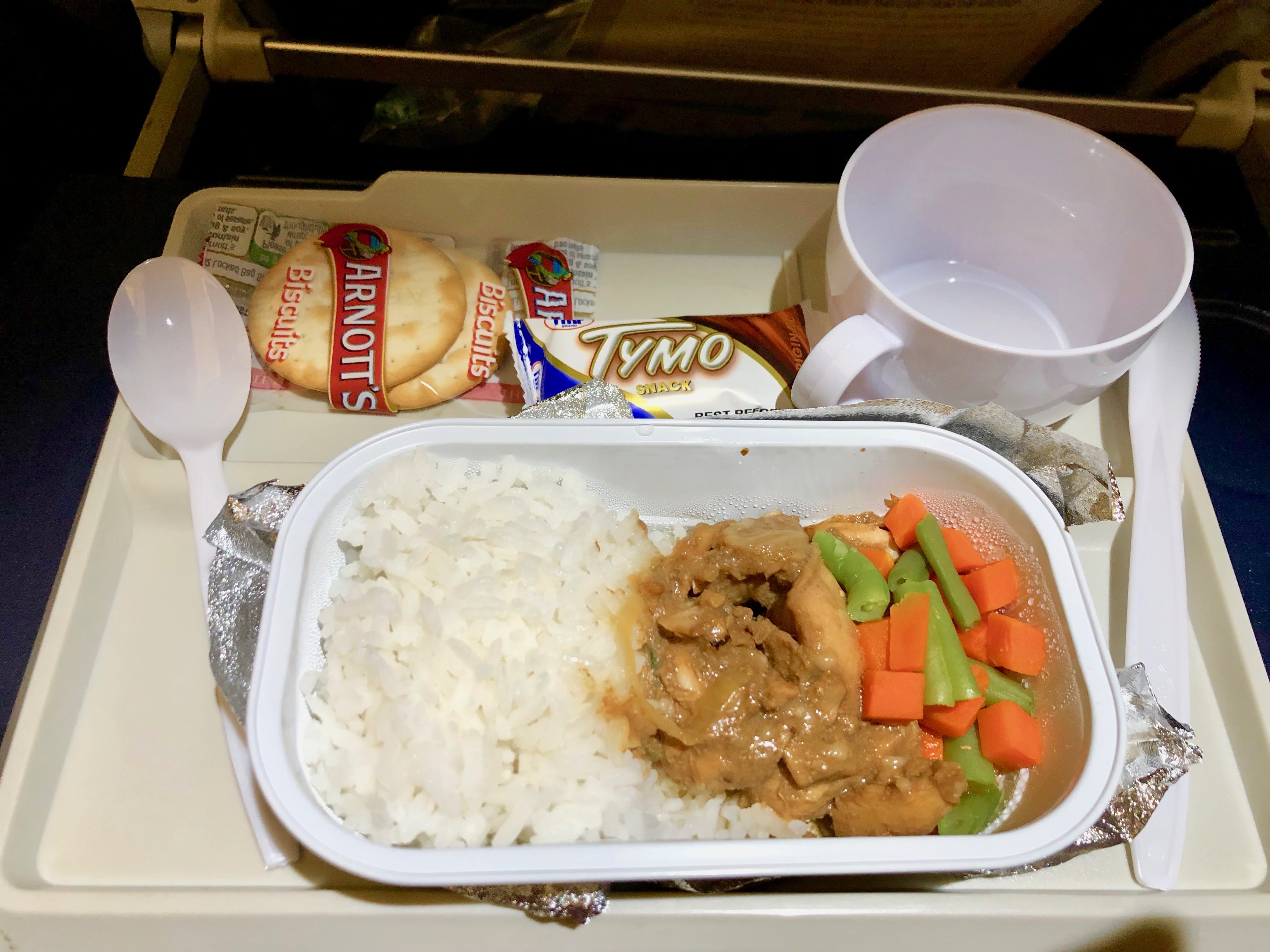 パン、ごはん、チキンカレー、チョコレートというラインナップ。植民地時代の名残でフィジーの人口の40%がインド系ということもあり、カレーが結構出たりするんですよね。現地でも。機内食でも出ました。。