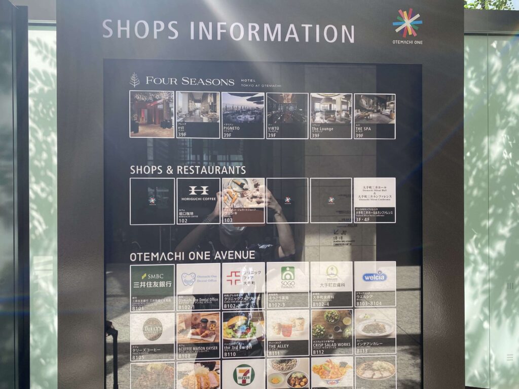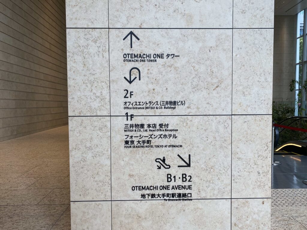 フォーシーズンズ 大手町は、OTEMACHI ONEというビルの高層階部分にあるので、建物内に入ると看板にもしっかりと記載があります▼
