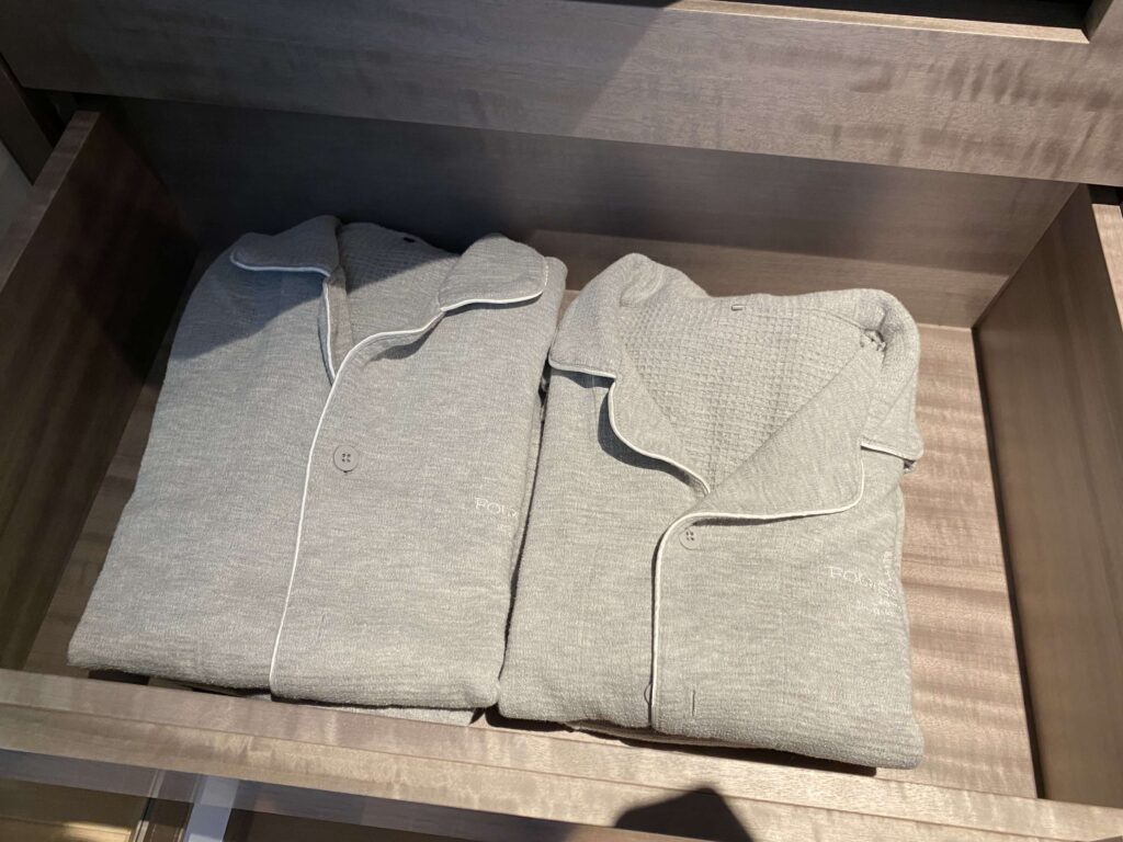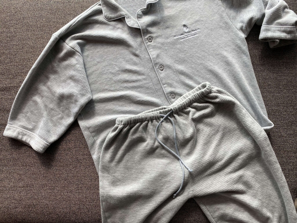 個人的に好きだった、寝巻き。他のホテルだと、浴衣であることがほとんどなのですが、フォーシーズンズ 大手町はパジャマ。
