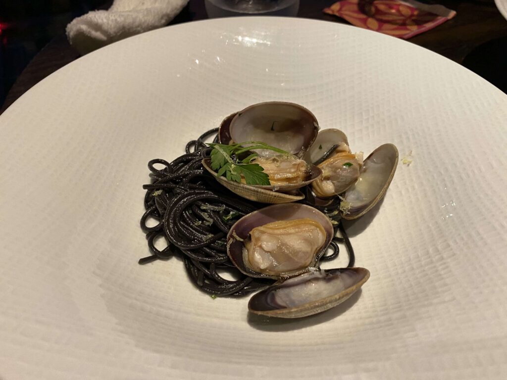 イカ墨のパスタ個人的にとても好きだったのがこのイカ墨のパスタ!イカ墨がパスタに練り込まれているタイプ。お歯黒になりません(笑)高級ホテルだし、そういうところに気を利かせてくれたのかな。
