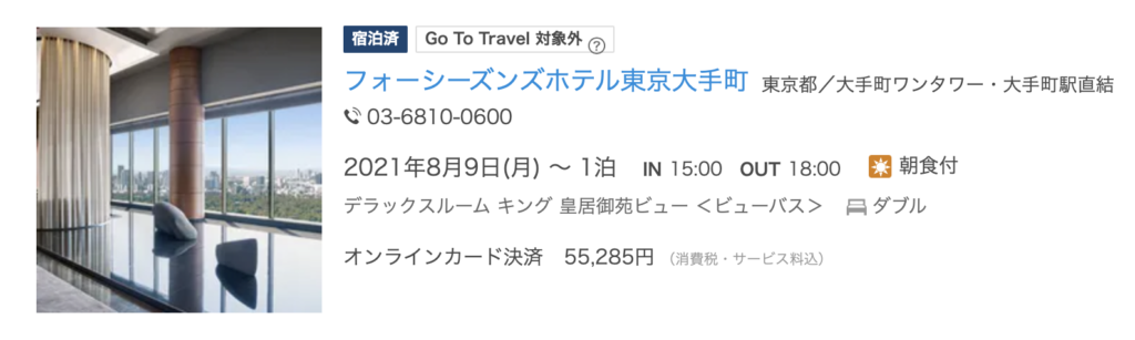と僕の宿泊情報はこんな感じ。値段だけ見ると高いなと思いますが、レイトチェックアウトと10,000円クレジットがついているので、ありえないほどの破格。