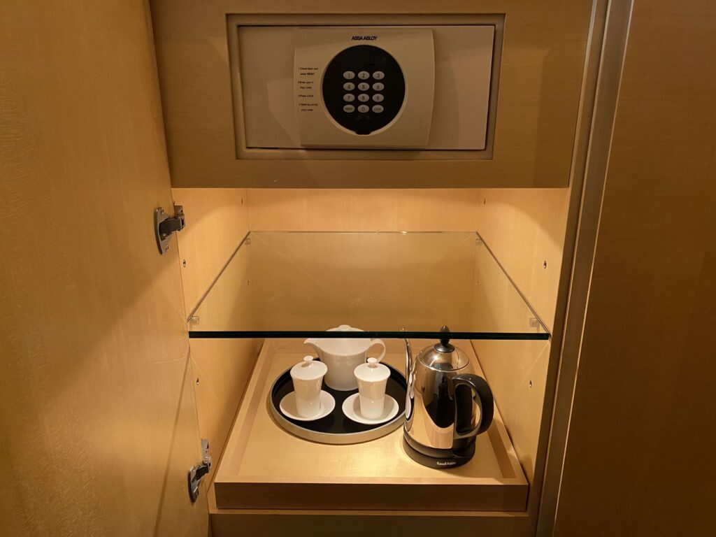 その横には、セキュリティボックスとケトルとマグカップ類も。