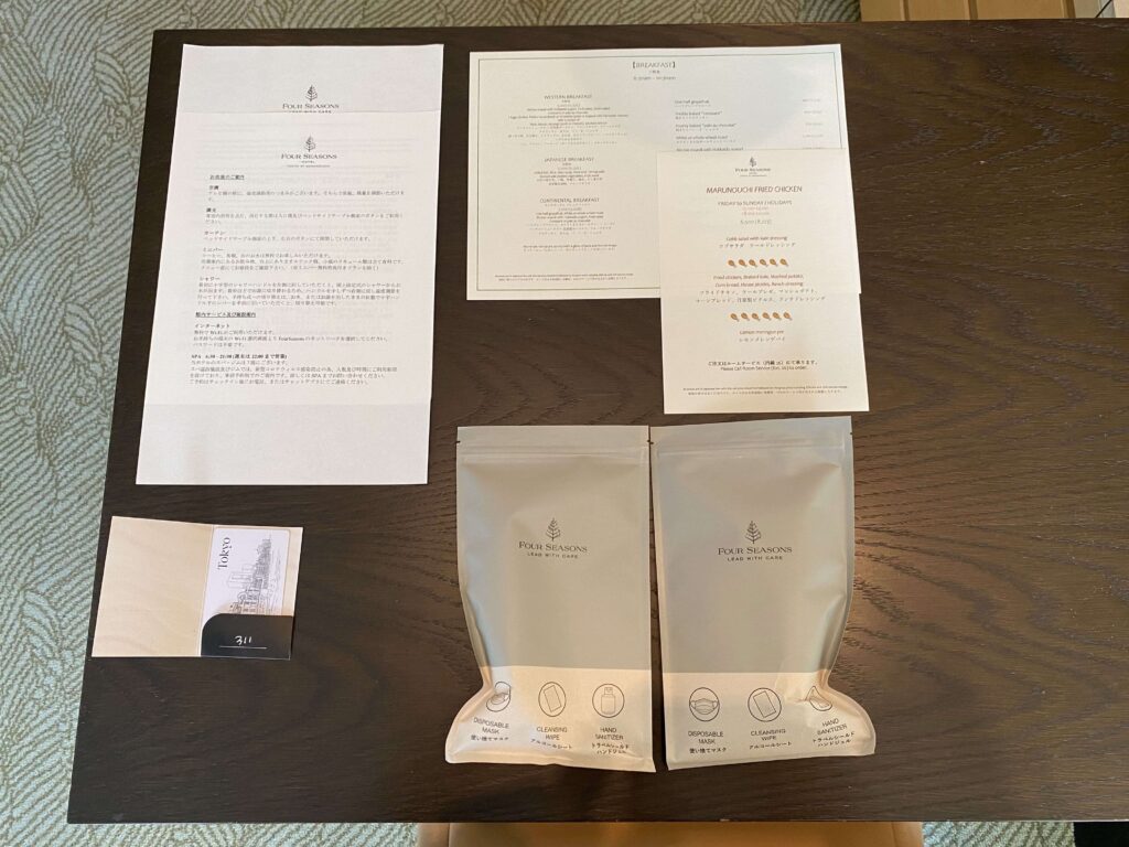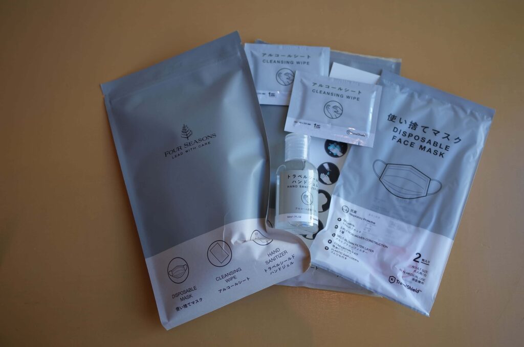 フォーシーズンズのオリジナル、コロナ対策グッズ。嬉しいですよね…。ハンドジェルとマスク、アルコールシート。デザインもやはり好き。
