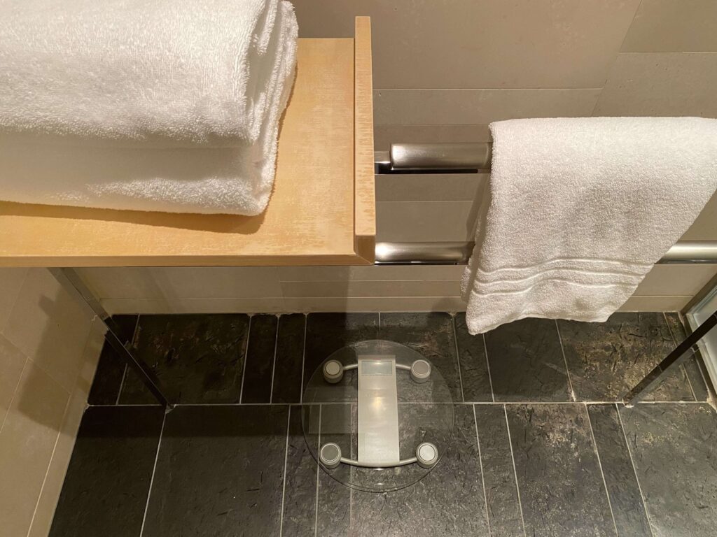 タオルの他には体重計もありました!シャワールームの中には、可動式とシャワーとレインシャワーどちらも!