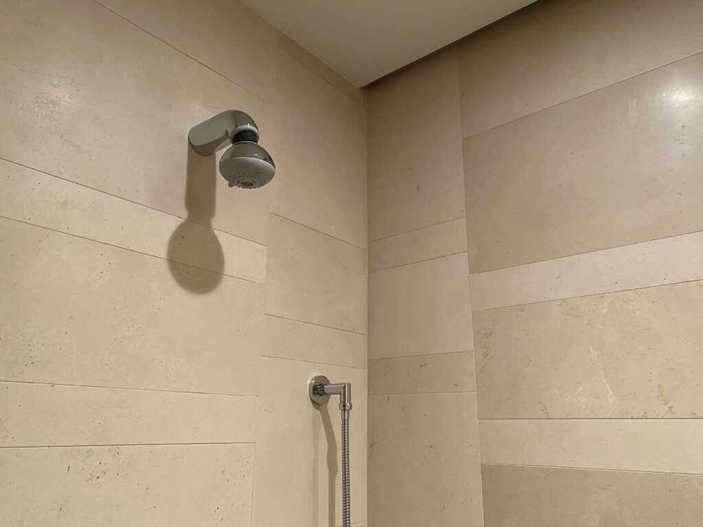 左手にシャワールーム、真ん中にバスタブがあって、その横にトイレ。では、まず左手から見ていきましょう。