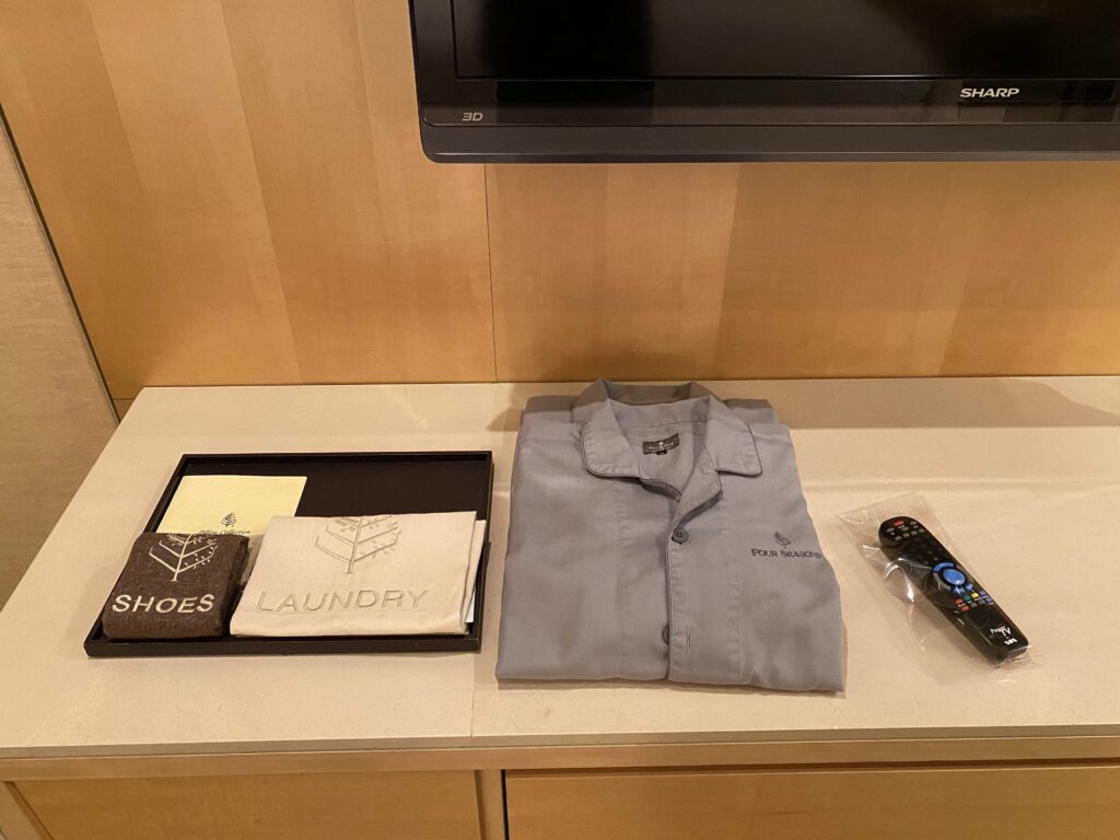 テレビ台には、靴やランドリーサービス、パジャマが置かれていました。