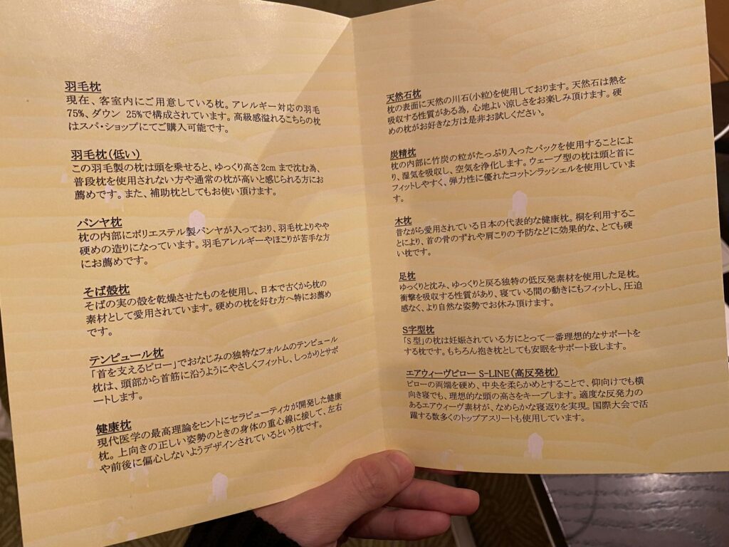 5つ星ならではの枕チョイスサービスも。今は引越しを考えているタイミングで、枕の交換も考えていたので、こんな形で色々と試すことができて嬉しい(笑)普段は、コアラ枕を使っているので、テンピュールとエアウィーヴをチョイス。