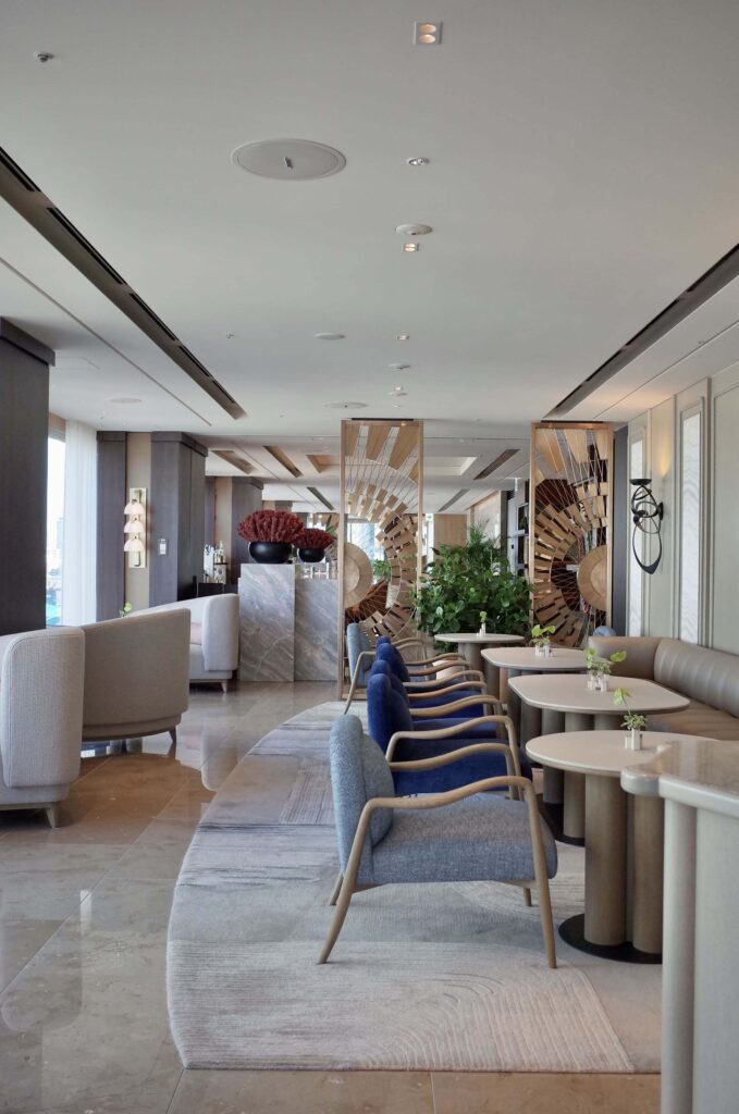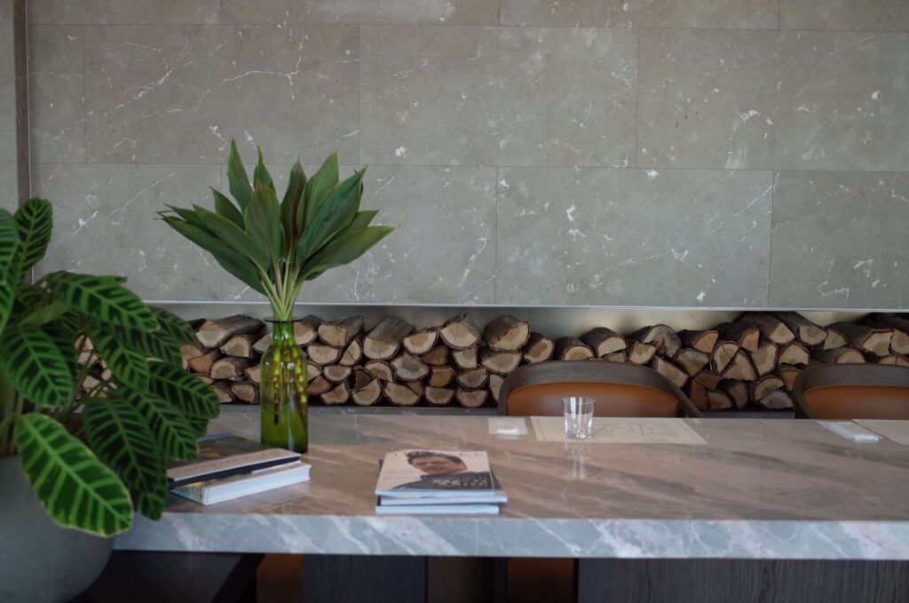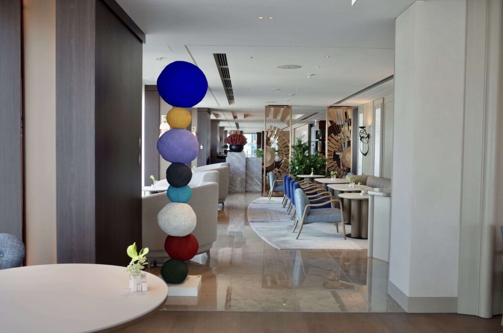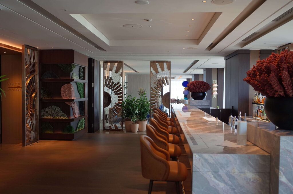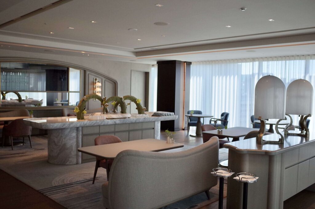 全体的にグレージュのインテリアでまとめられており、アクセントに、かすんだ赤、青、緑のインテリアが。ライティングもヨーロッパ風。さすがミシュラン®︎レストランのいわんばかりのクオリティでした。