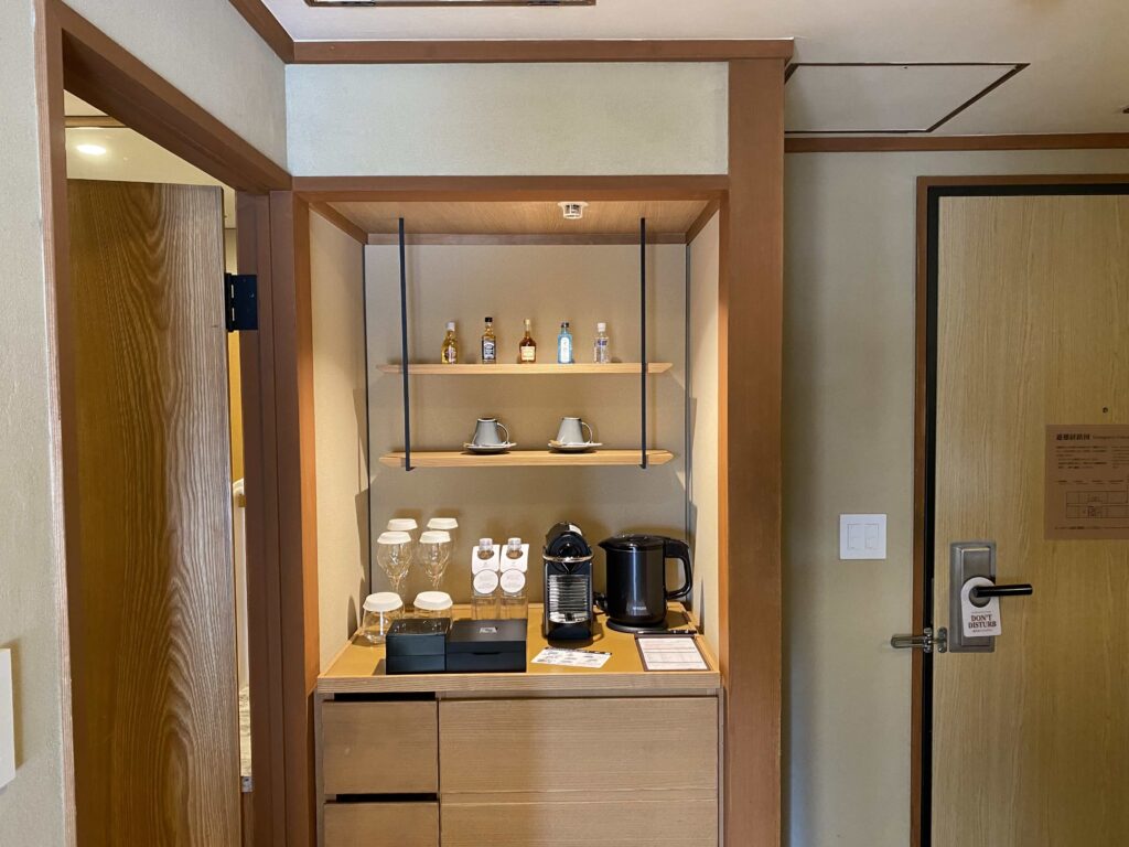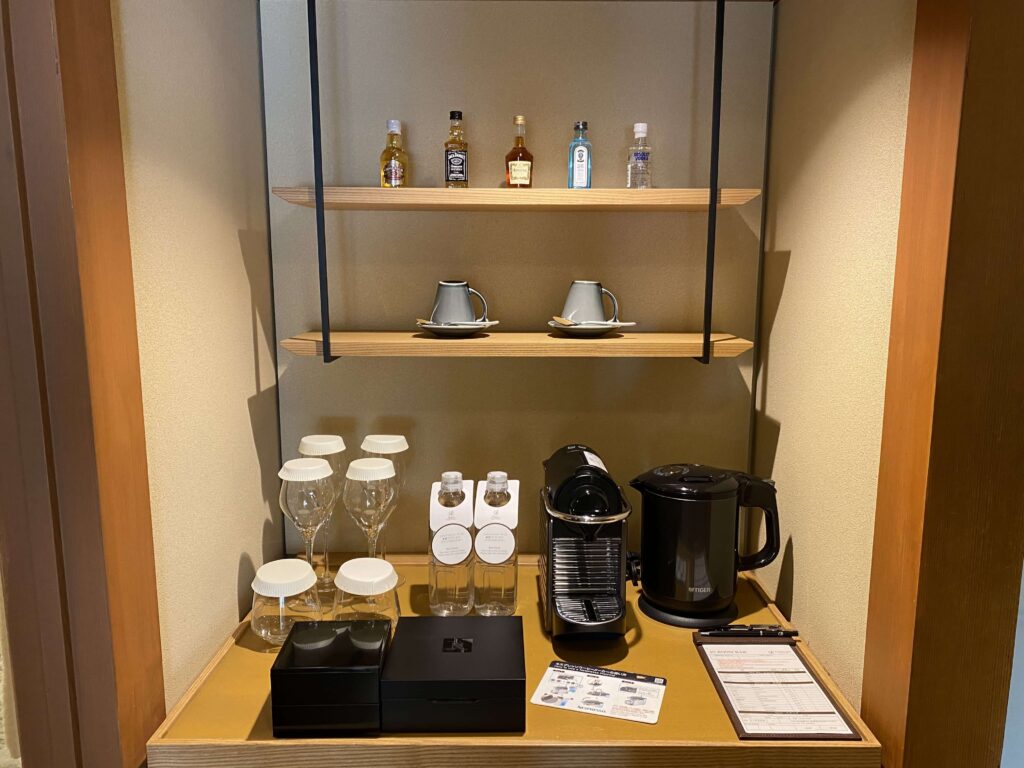 このような形でドアのすぐ横にミニバーコーナーが設置されています。ラインナップとしては、アルコール類にグラス・マグカップ・水・ポットやネスプレッソなど!