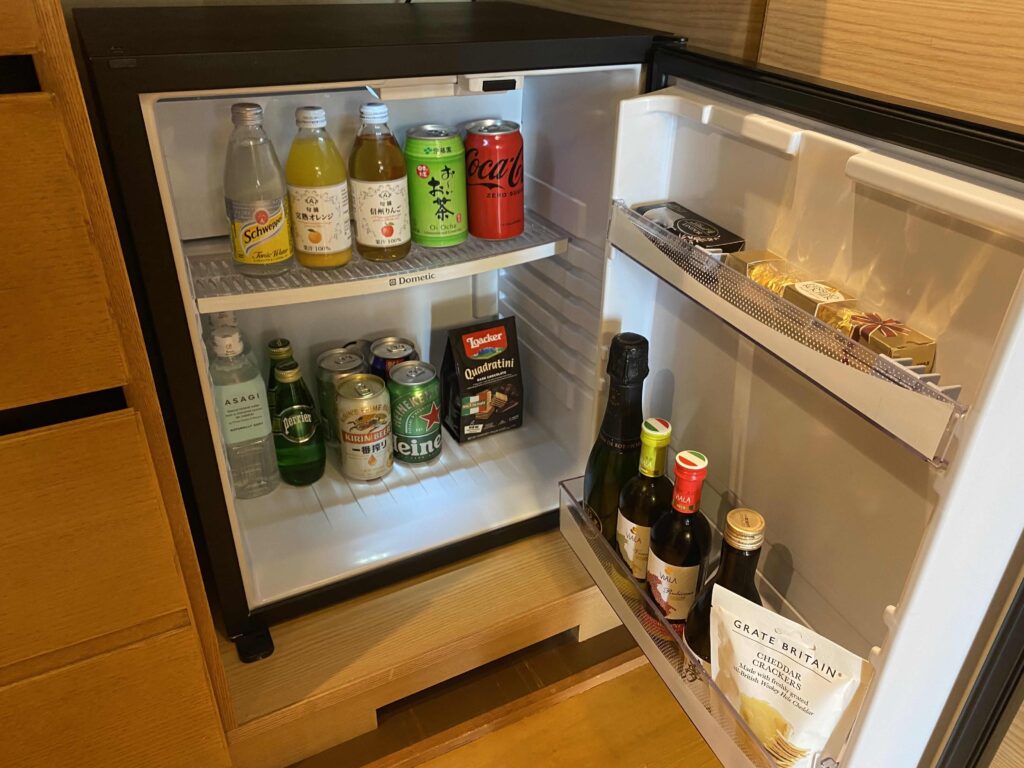 冷蔵庫に入った飲みものはセルフサービスペリエやクランベリージュースが入っているところが、高級ホテル感がありますよね。