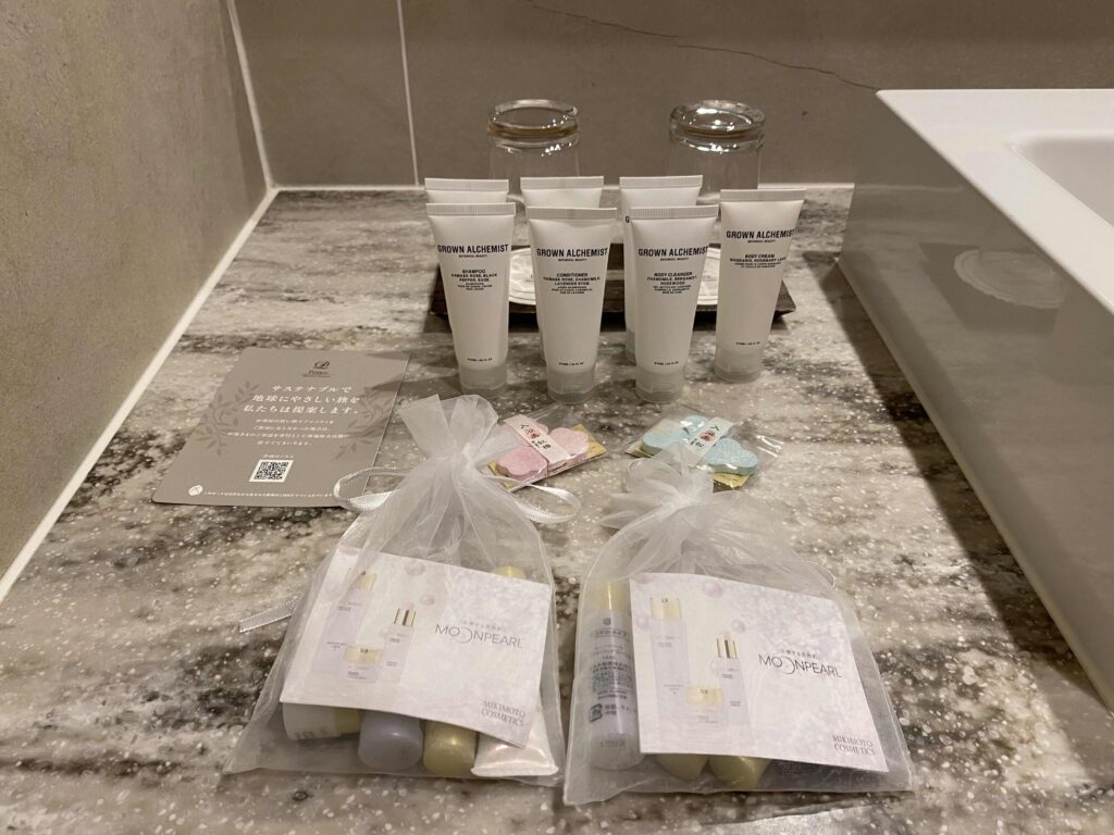 アメニティですが、手前が一休のダイヤモンド特典で、奥側のが通常アメニティです!