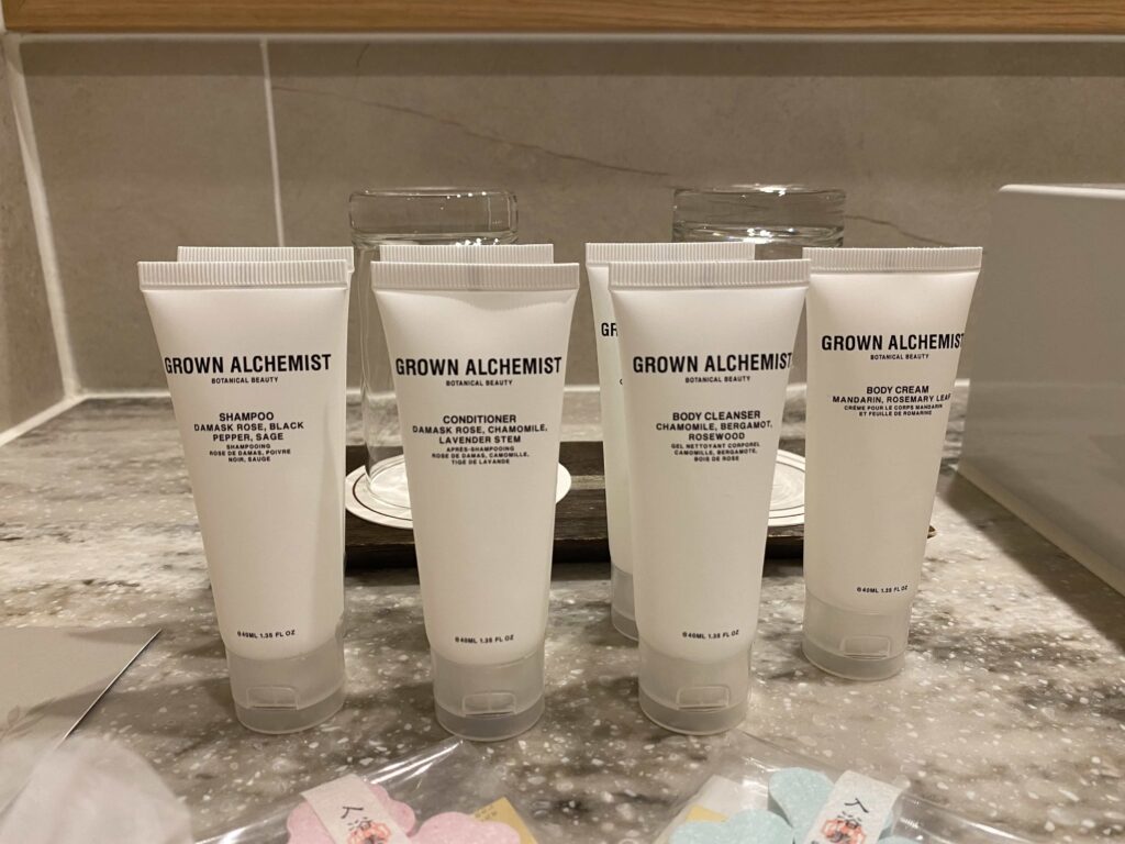 通常アメニティは、GROWN ALCHEMIST。オーストラリアのメルボルンで誕生したオーガニックブランドです。匂いはシトラス系でイソップとちょっと似ている感じの印象を受けました。イソップもメルボルン発だし、どちらかがインスパイアされたのかな、なんて。