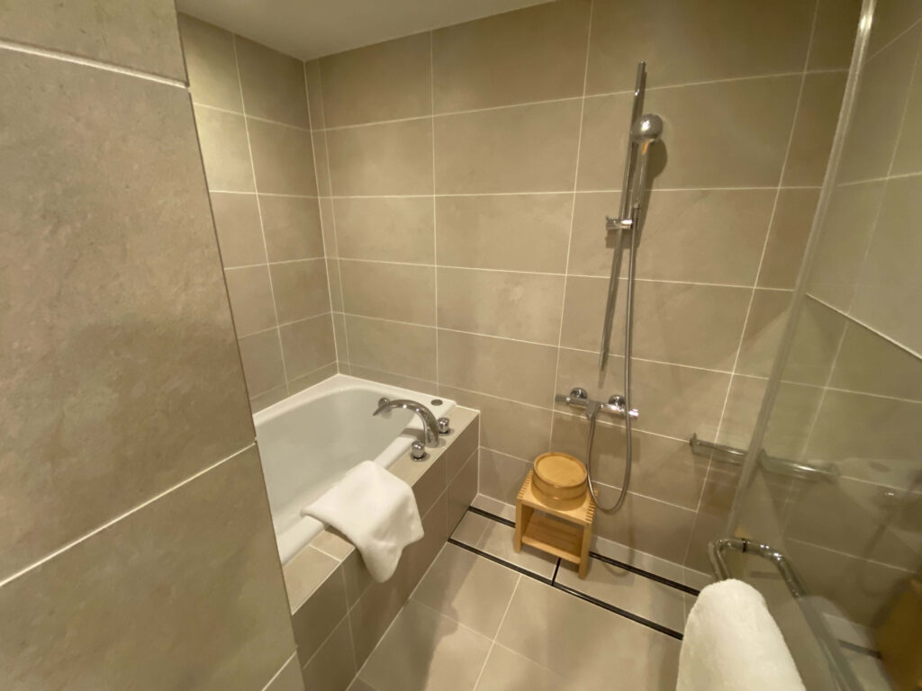 こちらが一番奥にあるバスルーム。バスルームとシャワーが一緒にまとめられている感じが日本人向けな感じで使いやすくて。椅子とおけは木の感じがまた雰囲気を出していて好きでした。
