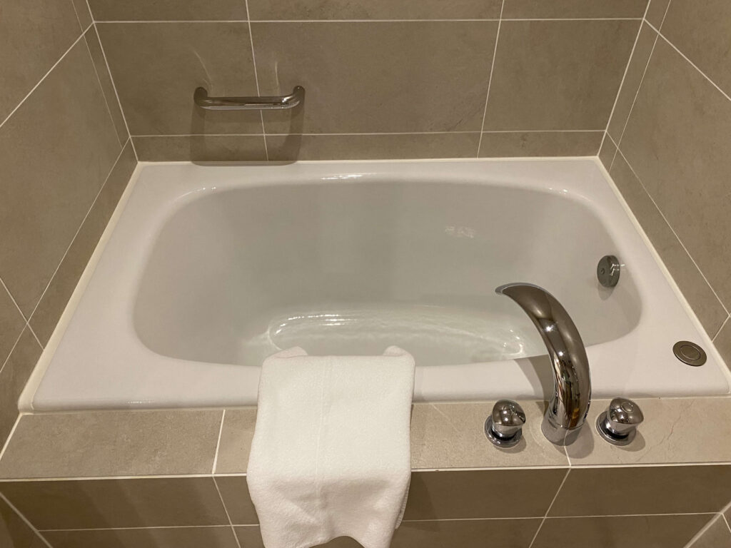 バスタブは小さく見えますが、170cmの僕でもゆっくりできる作り。高級ホテルでの楽しみの1つはバスタイムなので、入浴剤を入れつつ楽しみます…!最高のひととき。