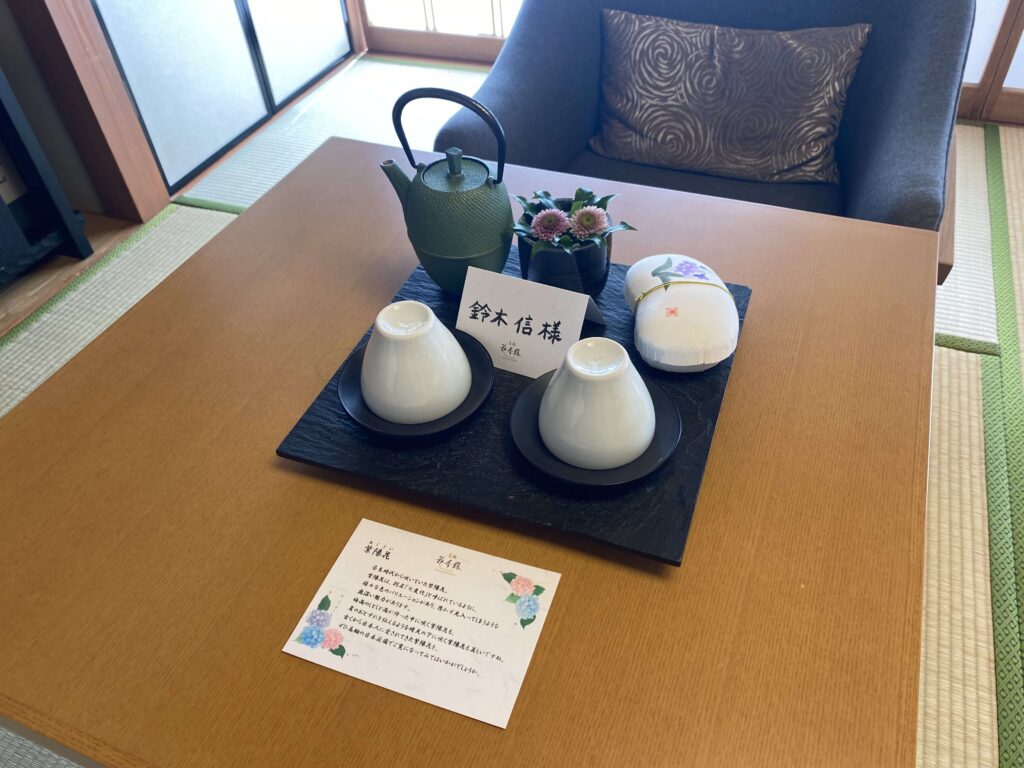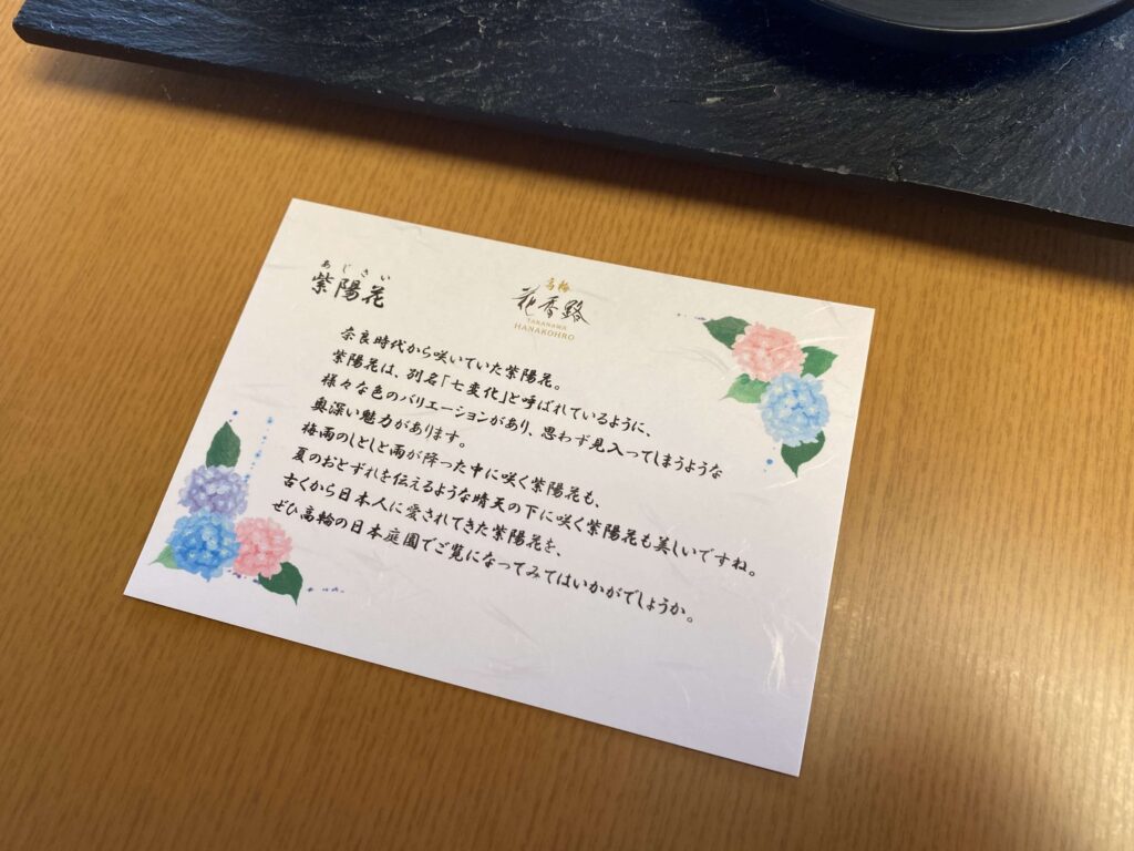 縁側部分に、生花(あじさい)が生けてあったのですが、花の説明が。こういうメッセージカードって1つ1つが愛おしくなりますよね。手書きじゃなくても、心遣いが本当に嬉しい。