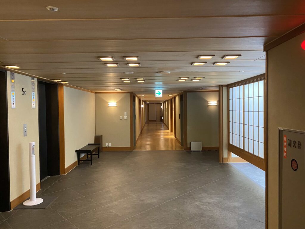 エレベーターホールから、通路。お部屋は16室とかなり限られているので、そこまで広くなく、すぐにお部屋へアクセスが可能です。