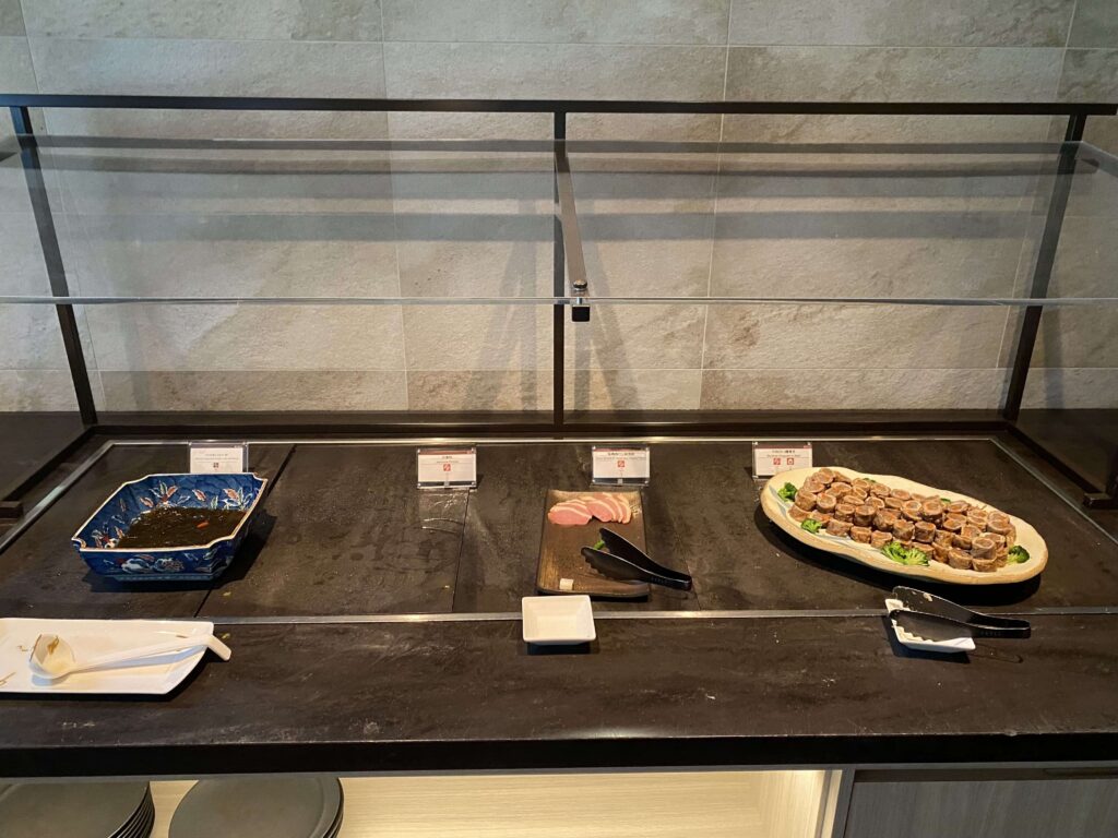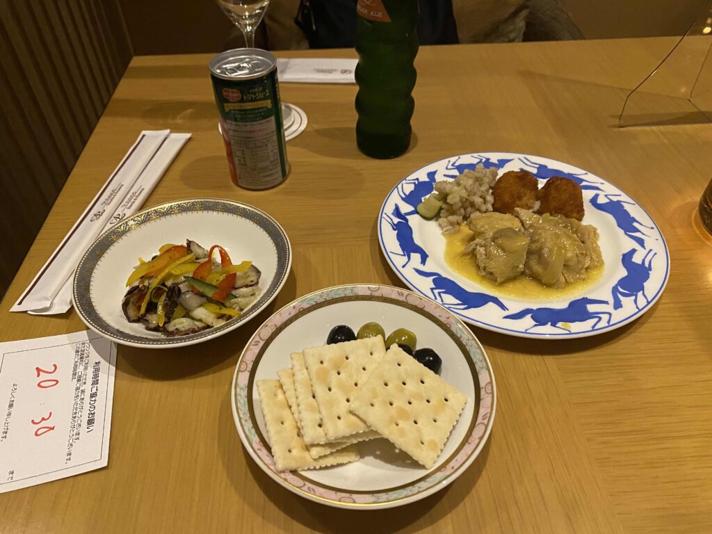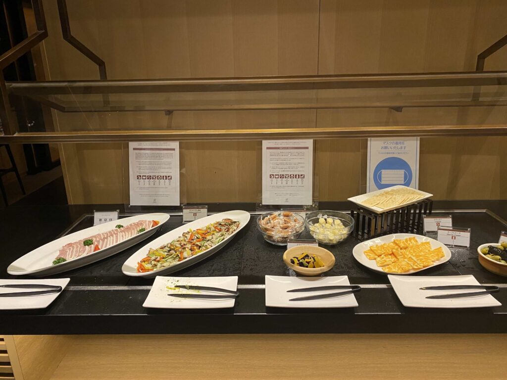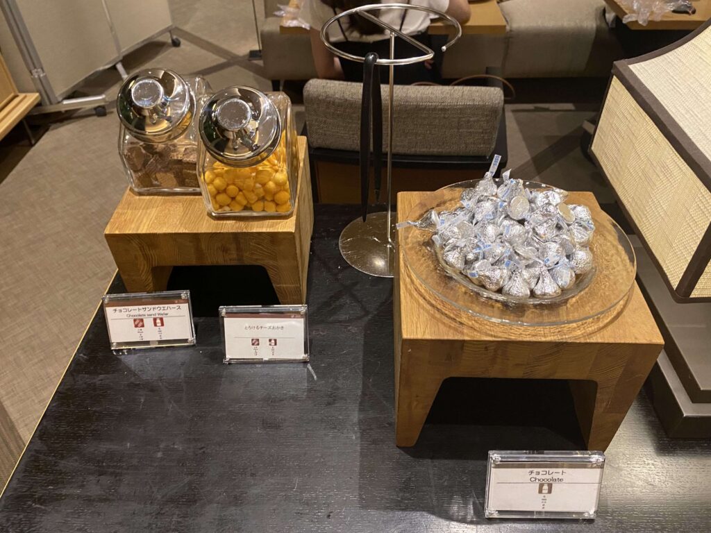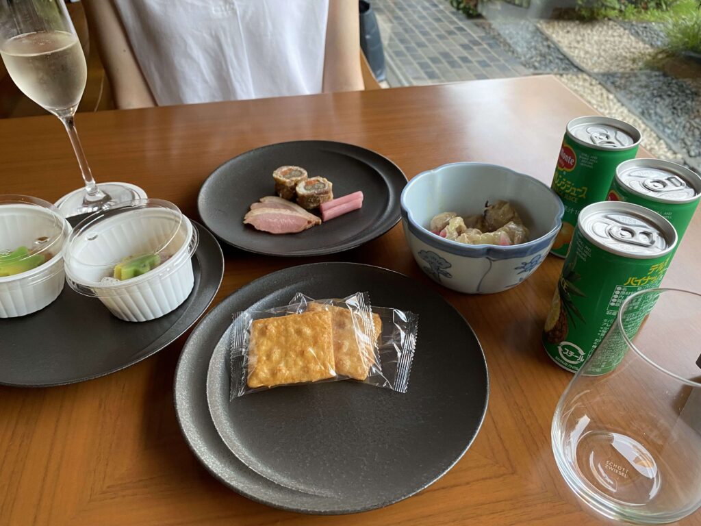 タコのバジル風味やチーズ類、オリーブなど、今までのラウンジは和な軽食だったのですが、こちらの軽食は洋食という印象です。