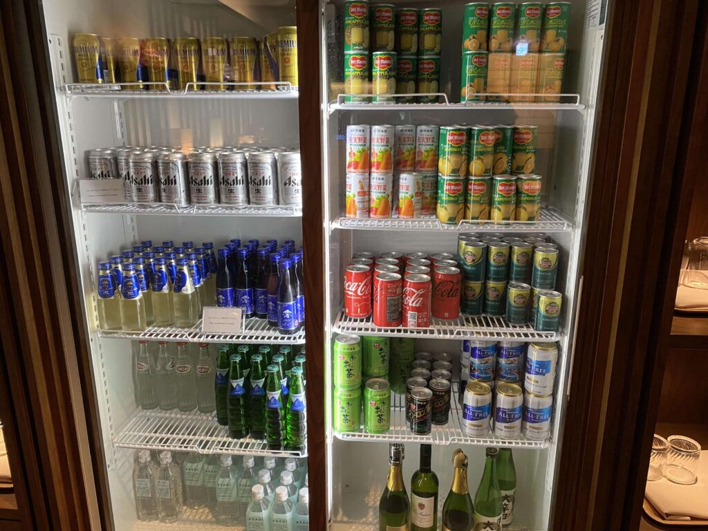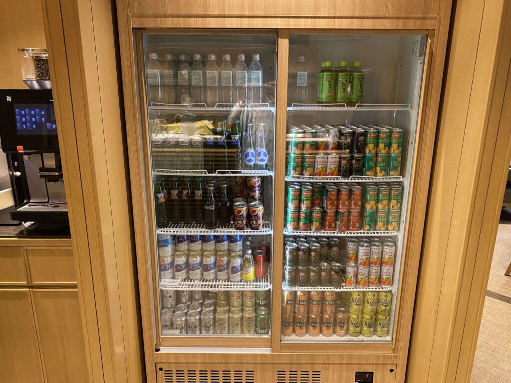 下には冷蔵庫があり、お酒やジュース類などが揃っていました。ラウンジで飲みものは無料なので、敢えて飲まなくてよいかな!ってお思いの方が多いのではと思います。