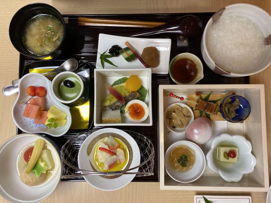 これが朝食です!ご飯は、普通のご飯かお粥かを選択可能です。THE 和食で、かなりボリューミーですが、美味しくいただきました。