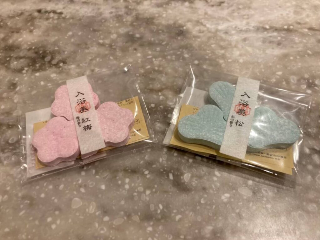 高級ホテルでは欠かせないバスソルトor 入浴剤!花香路の入浴剤は、松や梅といった和の香り。旅館にいる気分がアップして嬉しい計らい!