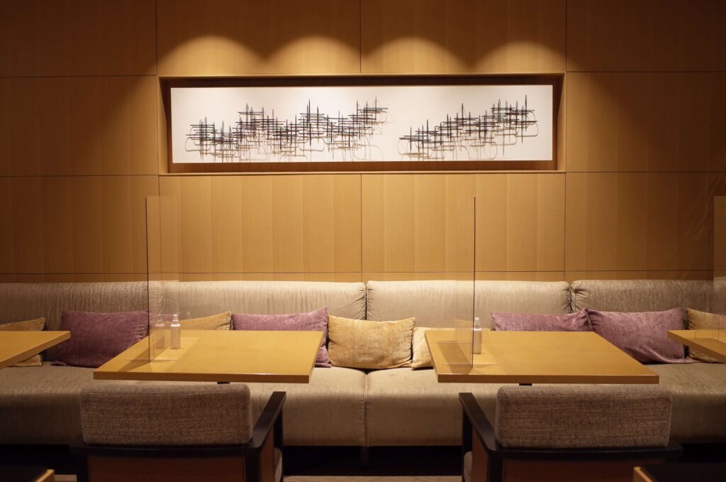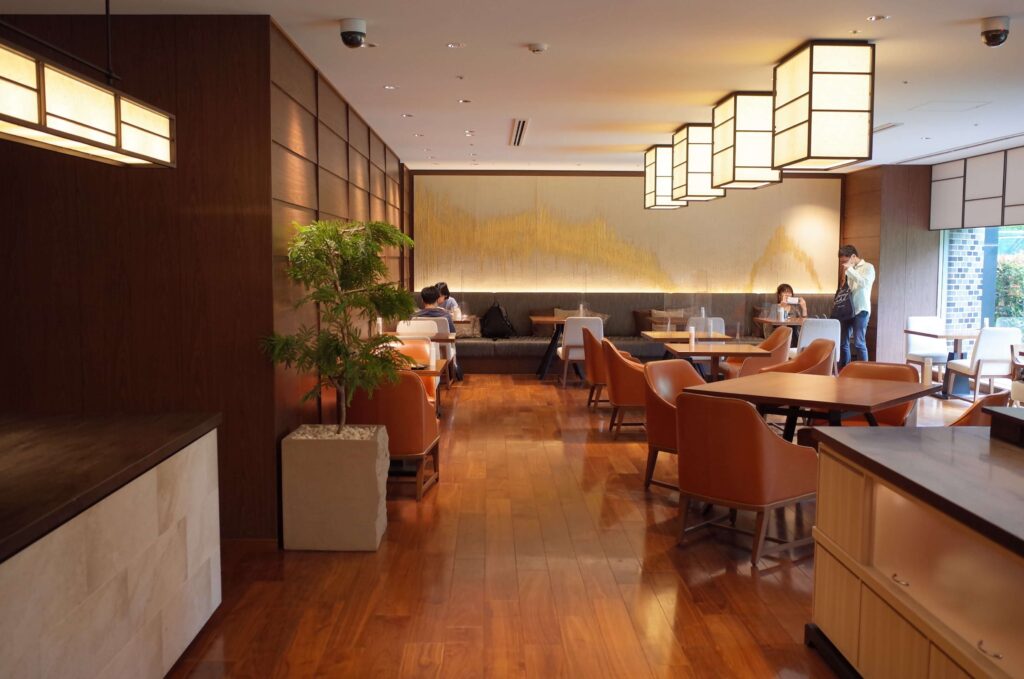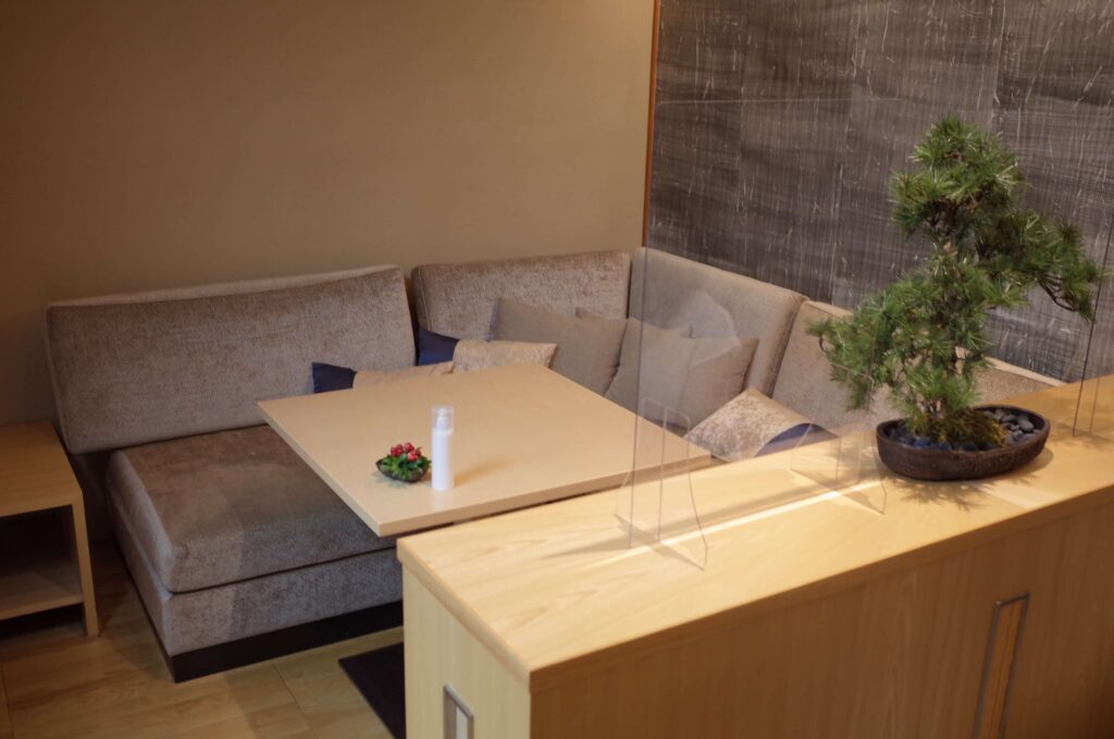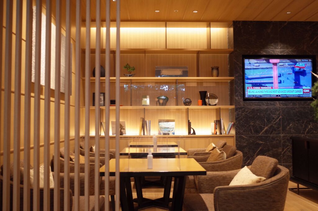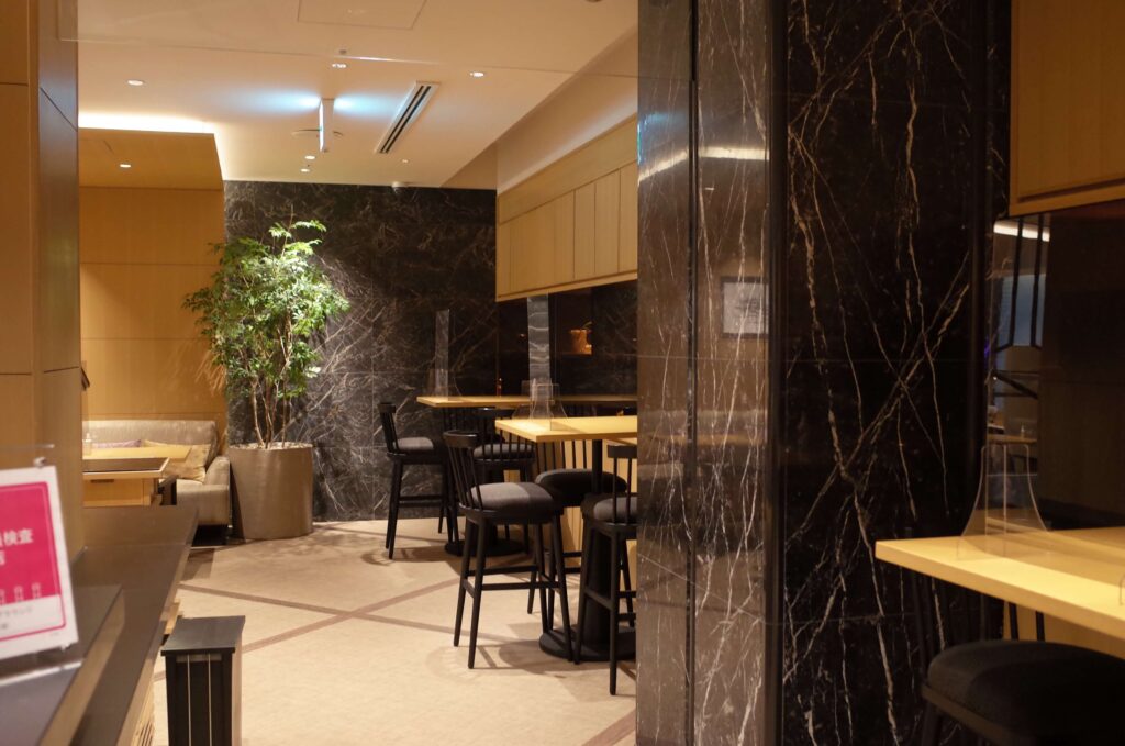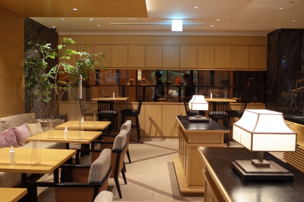 まずは花香路のラウンジ。テーブルの数がかなり限られている印象でした。コロナの影響もあるかもしれませんが、チェックイン時に満席だったため、本来はラウンジでチェックインだったところ、お部屋でのチェックインになんてことが。