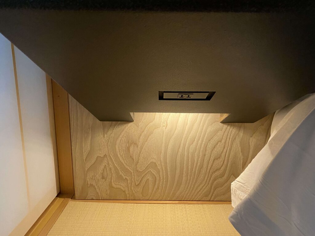 ただ、ベッド横のスタンドの下にコンセントがあったことに、かなりのこだわりを感じました…。コンセントって生活感でますし、非日常感のために、ここまで。すごすぎる。