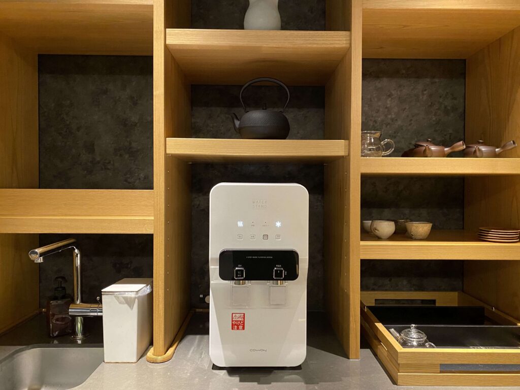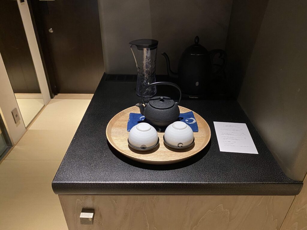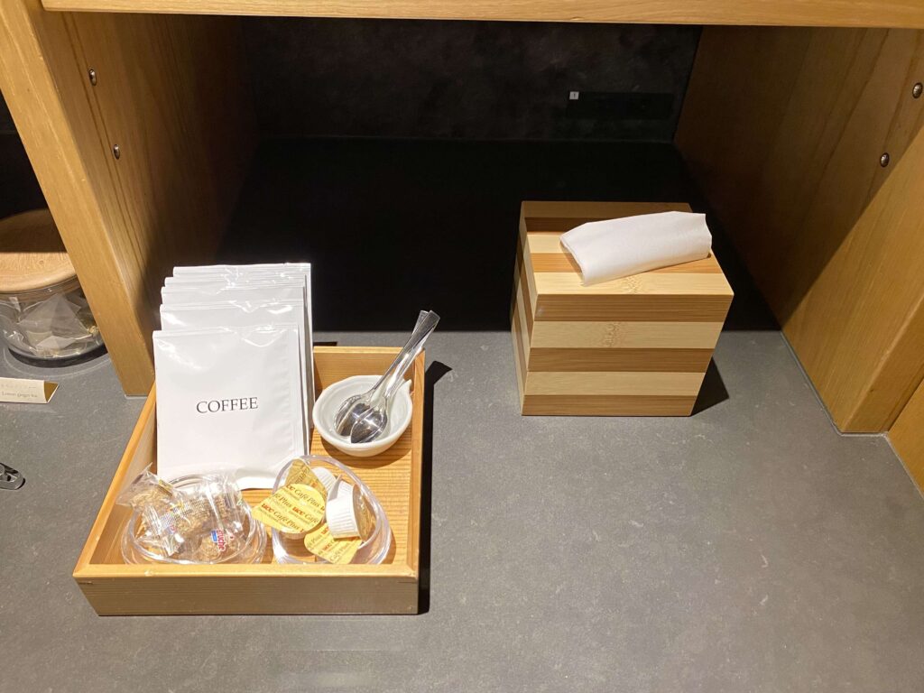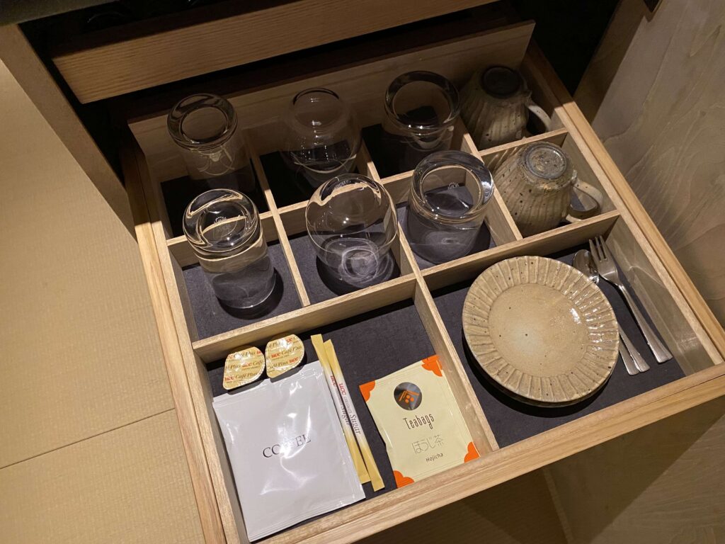 次に、横にあるミニバーコーナー!上には、ポット、透明の容器、湯呑みなどのが設置。