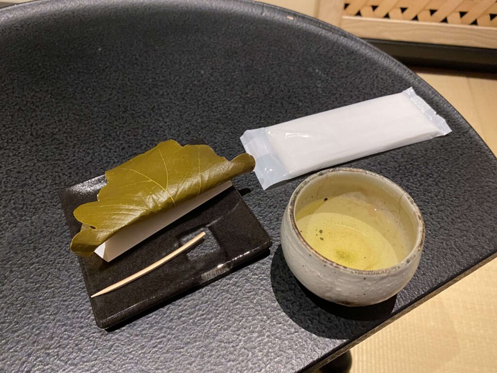ウェルカムスイーツは、季節のかしわもちと緑茶(特別な産地のものだったのですが失念してしまいました…)。美味じゃないわけがありません。