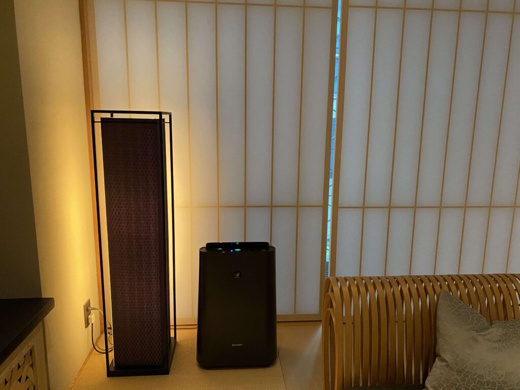間接照明もこだわりのもの。今やコロナのせいか、空気清浄機はビジネスホテルとかでも当たり前になってきましたよね…。加湿器付きだとより嬉しい…。もちろん、星のや東京のは加湿付き。