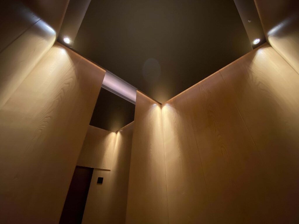 エレベーター内は、温もりが感じられる木が基調に。