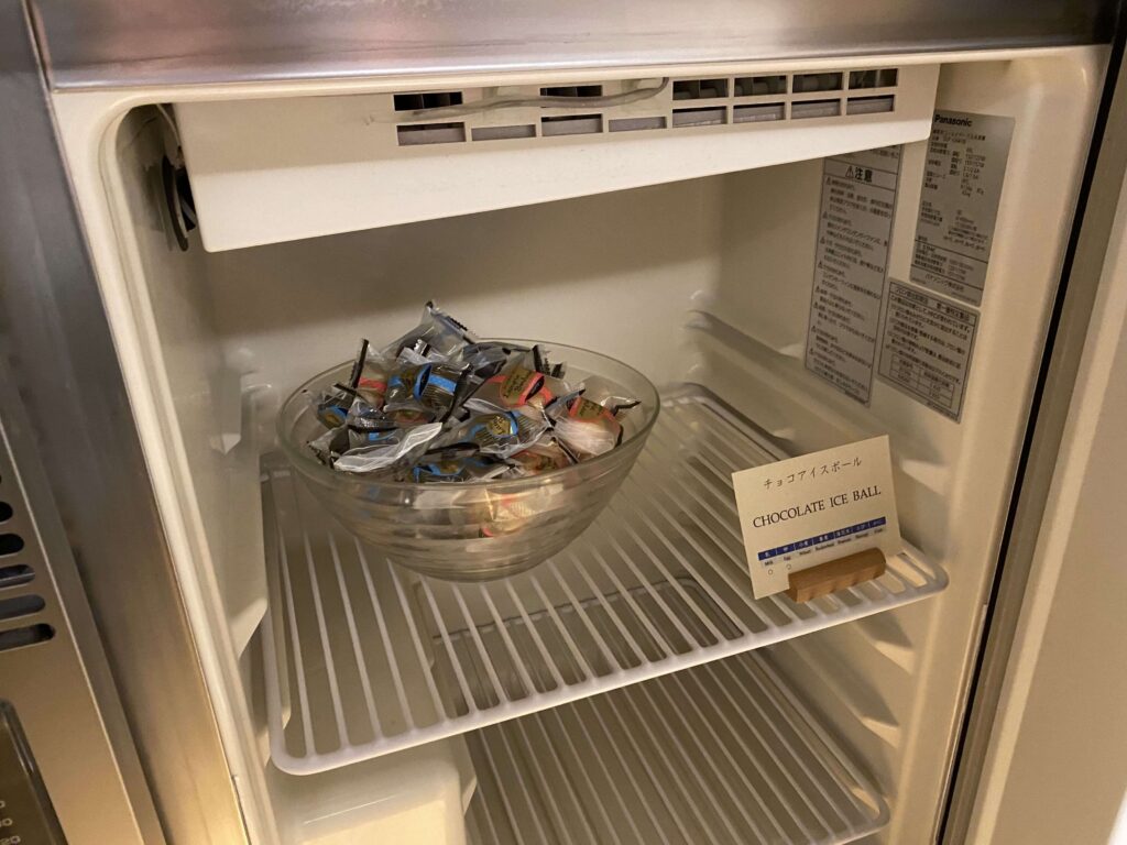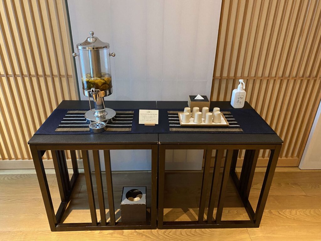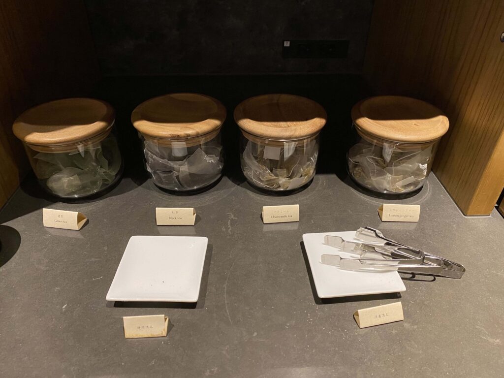 透明な容器は、水入れです。宿泊者専用ラウンジにウォーターサーバーがあるので、そこに汲みに行く形です。ペットボトルの水は設置されていないので、ご注意を。