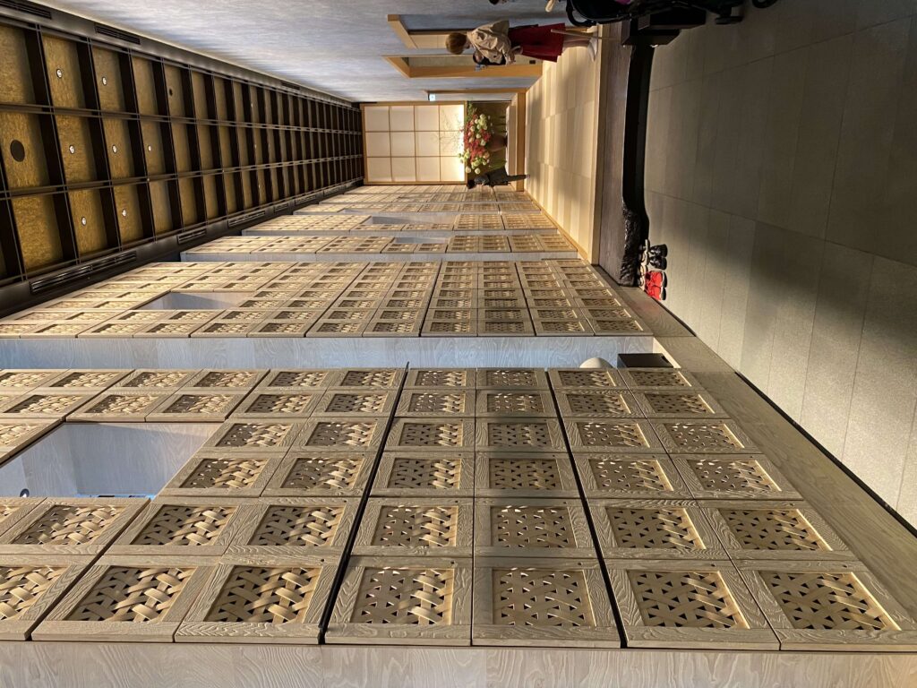星のや東京のモデルは旅館。ということで、玄関で靴を脱ぎます。玄関を入ってすぐ左にあるのは、大きな竹細工の靴箱。本当に見事の一言です。