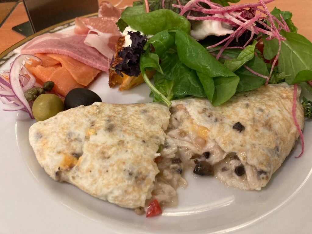 名物でもある、タンパク低カロリーの卵白だけで作った「ホワイトオムレツ」。玄米を食べて育った鶏から生まれた「玄米卵」を使用しているそう。
