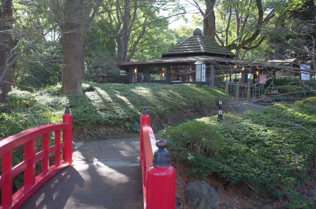 印象的な赤い橋。錦鯉もたくさん飼われていて、優雅に泳いでる姿を見ることができます。