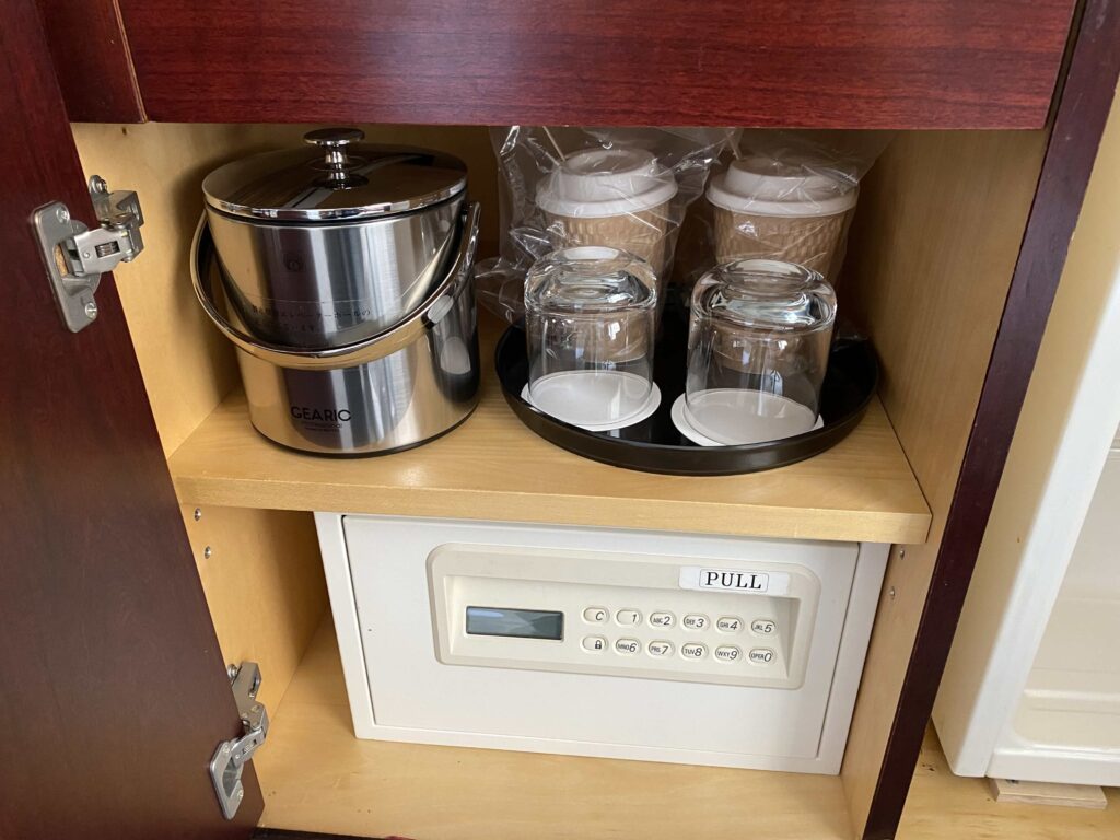 ハイアットリージェンシー東京 ミニバー左の段には、グラス / コーヒーカップ、氷入れ、セキュリティーボックス。