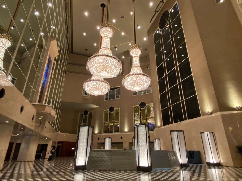 ハイアットリージェンシー東京 シャンデリア進むと、ハイアットリージェンシー東京の象徴でもある3つのシャンデリア。そのシャンデリアに照らされた、8階建て分の開放感のある空間。