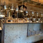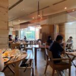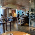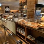 ハイアットリージェンシー東京 カフェ外観入り口から見ると、ウッディ調で温かみのある雰囲気。とはいえシャンデリア風のライトもあってラグジュアリーな感じもあり、見事な融合美。