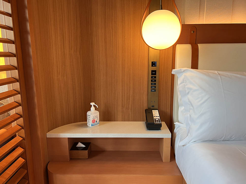 逆側には電話とスイッチ類。下にはティッシュが置かれていました。他のホテルとは違って置かれているものが最低限の印象を受けます。