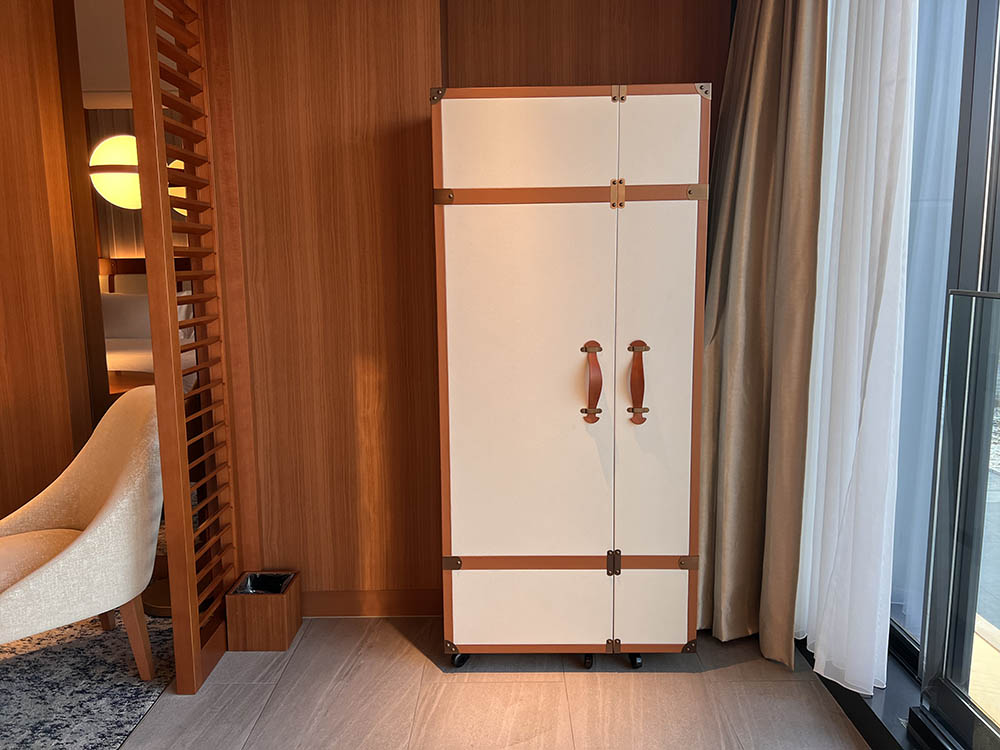 ではさっそくお部屋の内装を見ていきましょう!お部屋のレイアウトとしては、ビジネス保テルっぽく、入るとすぐ隣にクローゼット。そしてバスルームがあり、奥にリビングルームがあるつくりでした。