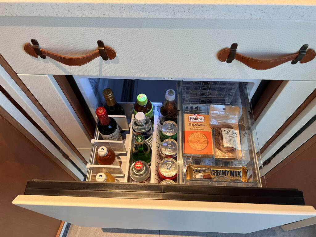 下のテーブルを開けると…!以下のように、飲み物類やお菓子類がありました。