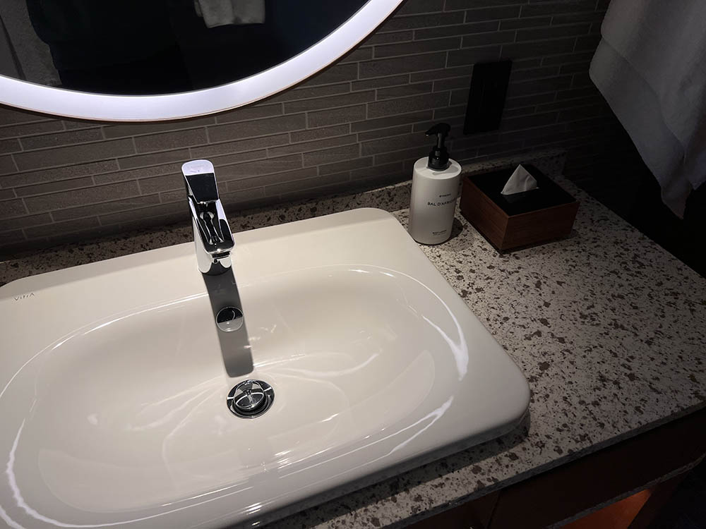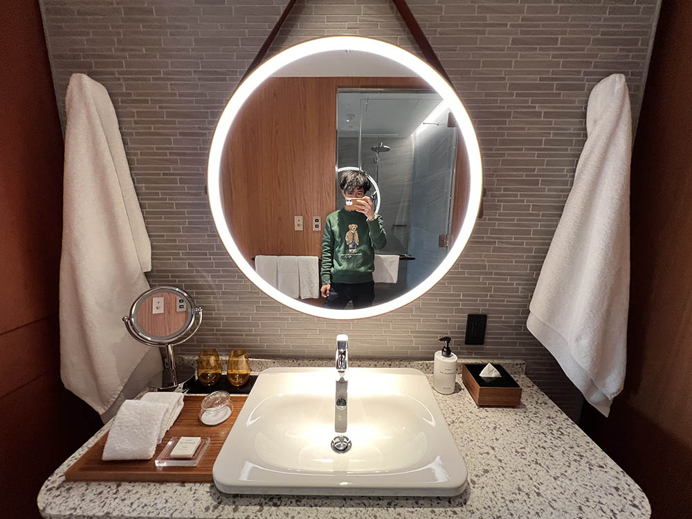 高級ホテルならでは拡大鏡も設置。右側にはバイレードのハンドソープ。