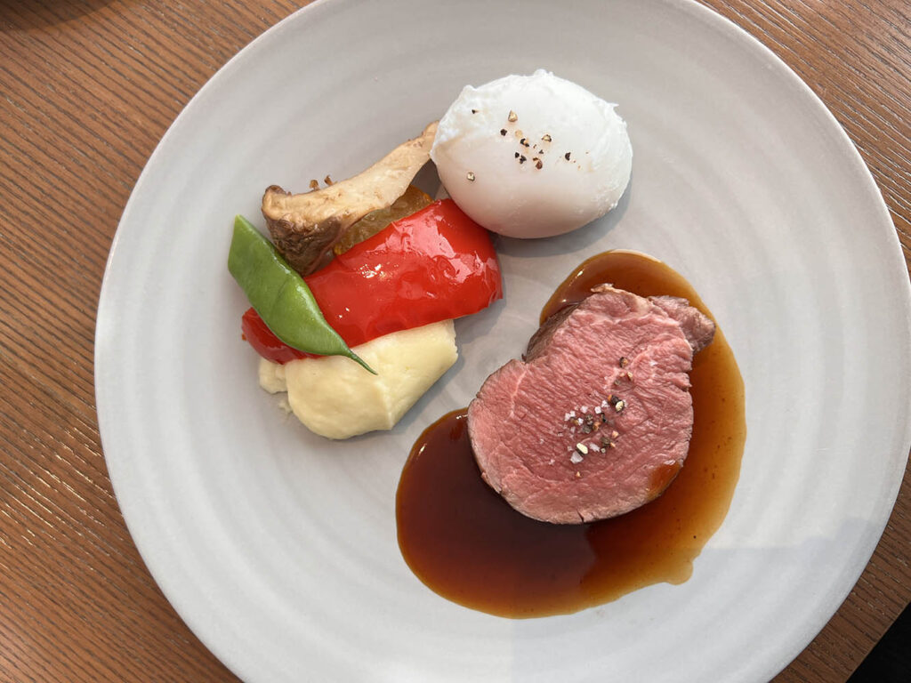 ジュース、サラダ、特製スープ、パン、メインから構成され、朝からフィレ肉のステーキを選択可能!
