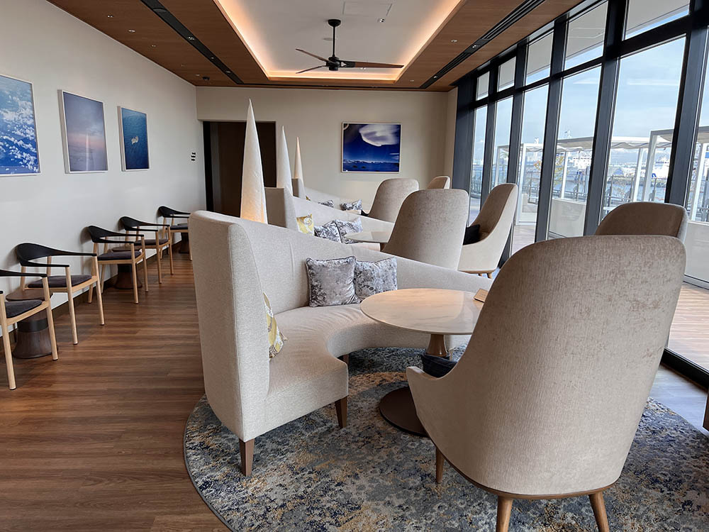ソファーに丸テーブルに椅子。こちらは横浜の景色を見ながらゆっくりしたいゾーンですね。アートもあってよき。